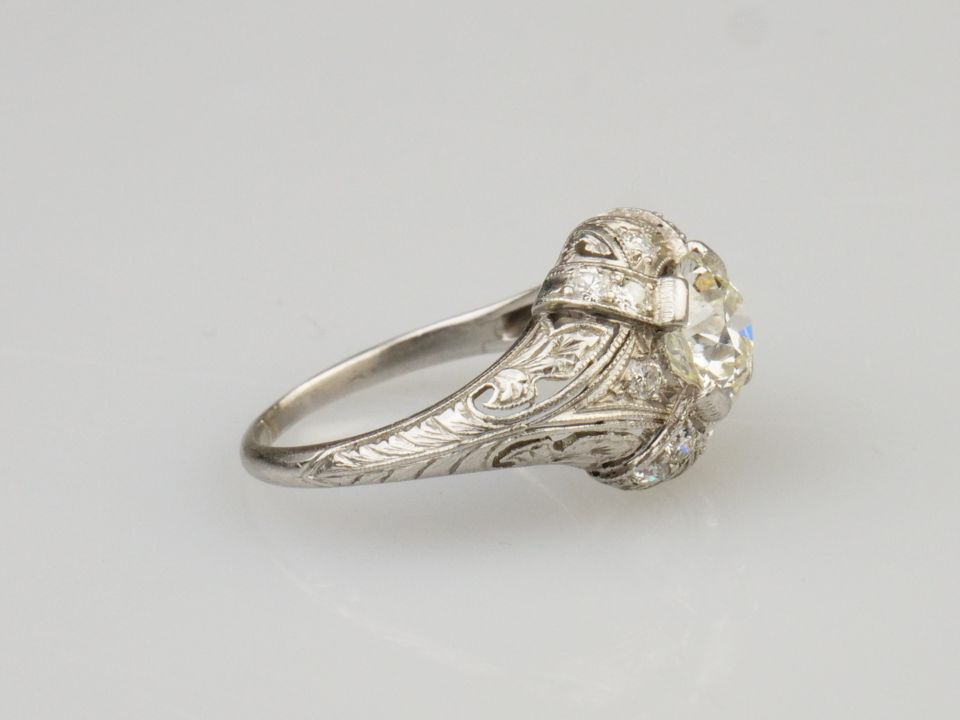 platinový prsten s diamanty briliantového brusu, kvalitní centrální kámen o hmotnosti 1,3, čistota VS1 a barva M-N, drobnější diamanty briliantového brusu (12 ks) o hmotnosti cca 0,34 ct, Pt btto 4,90g/900/000, velikost 52; západní Evropa, kolem roku 1935; atest Puncovního úřadu, znalecký posudek