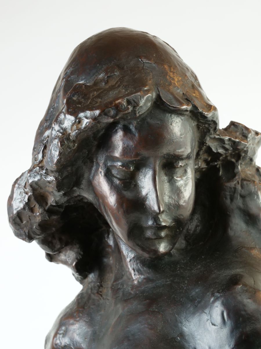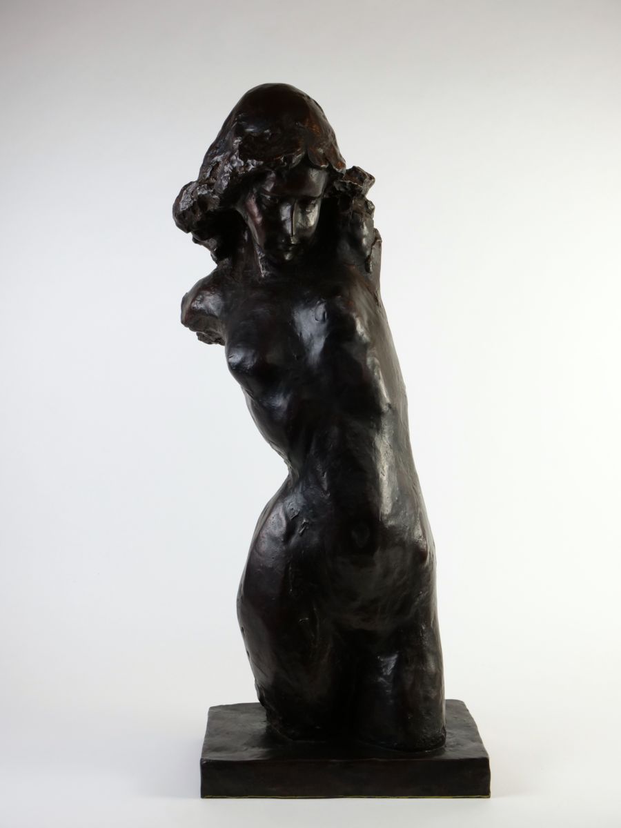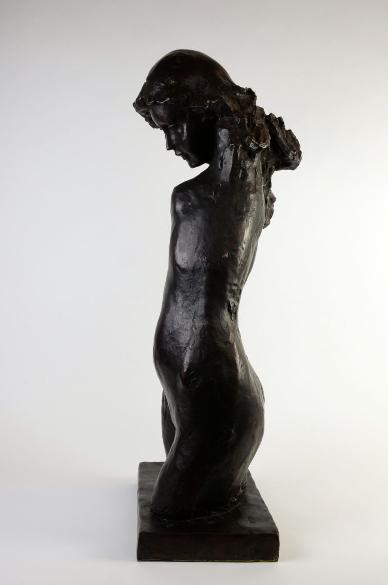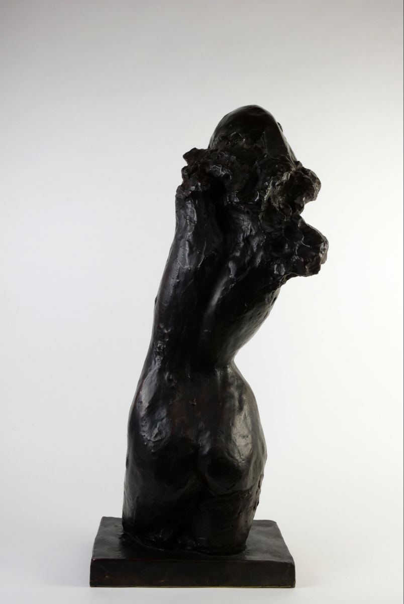 sochařsky výrazně ztvárněné dívčí torzo, bronzový odlitek podle původního sádrového modelu, výška 68 cm, šířka 28 cm, kolem r. 1980; signováno na plintě a značeno jako 3. odlitek ze 4; Blanka Voldřichová (1934 - 2021), studia u prof. L. Píchy a J. Kavana na VŠUP v Praze, u B. Cerovace v Záhřebu a J. Achtzingera v německém Selbu