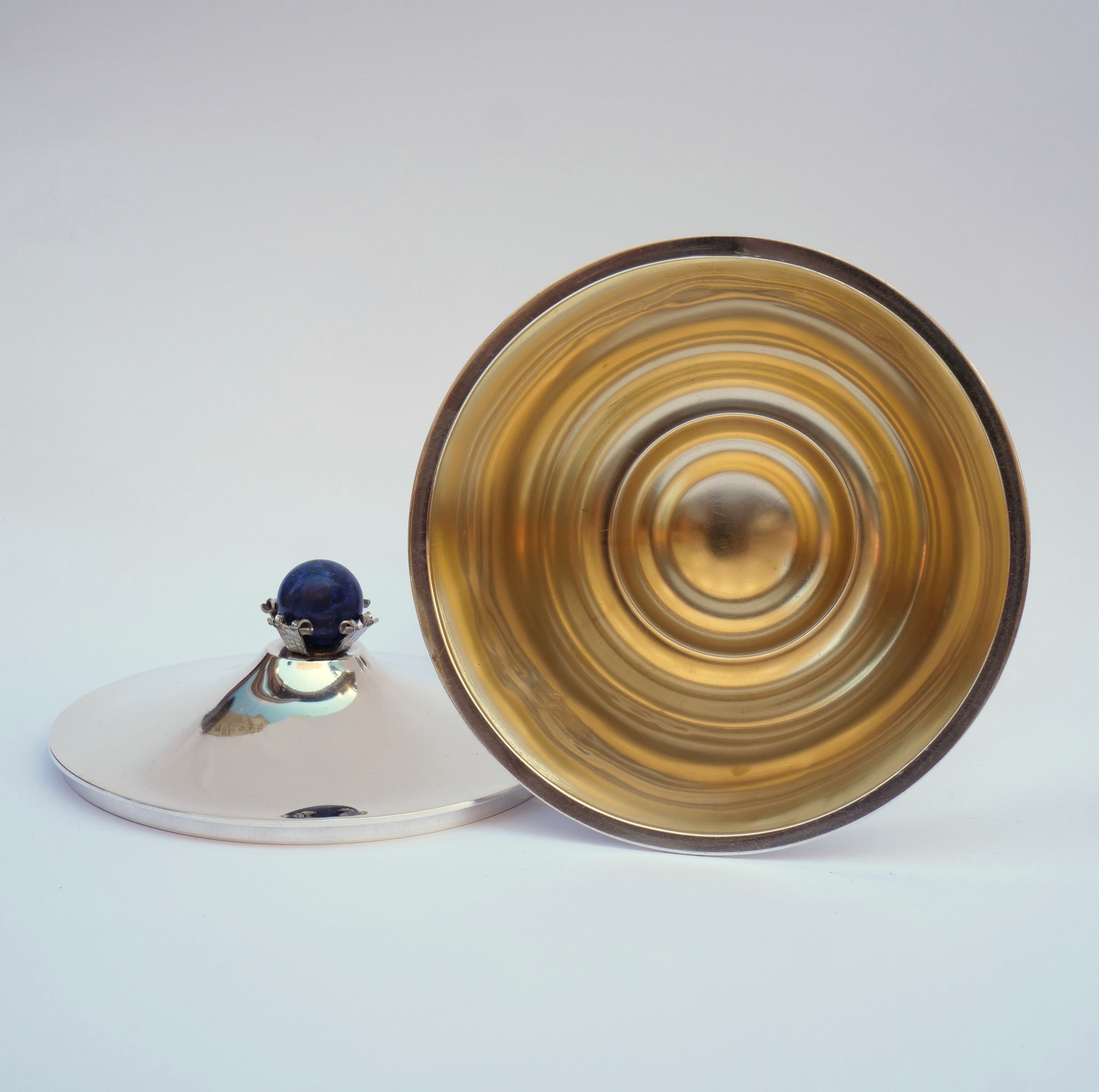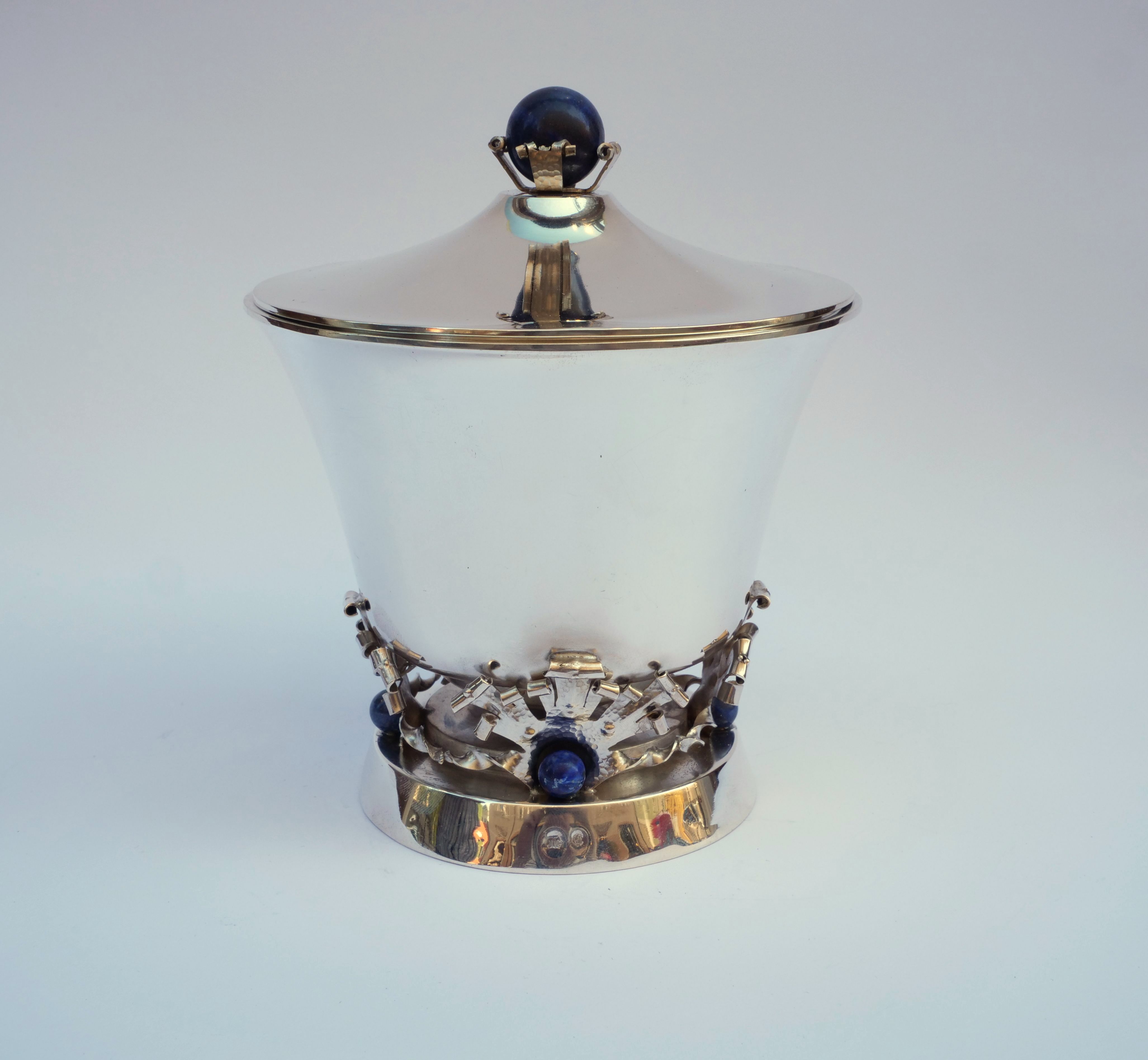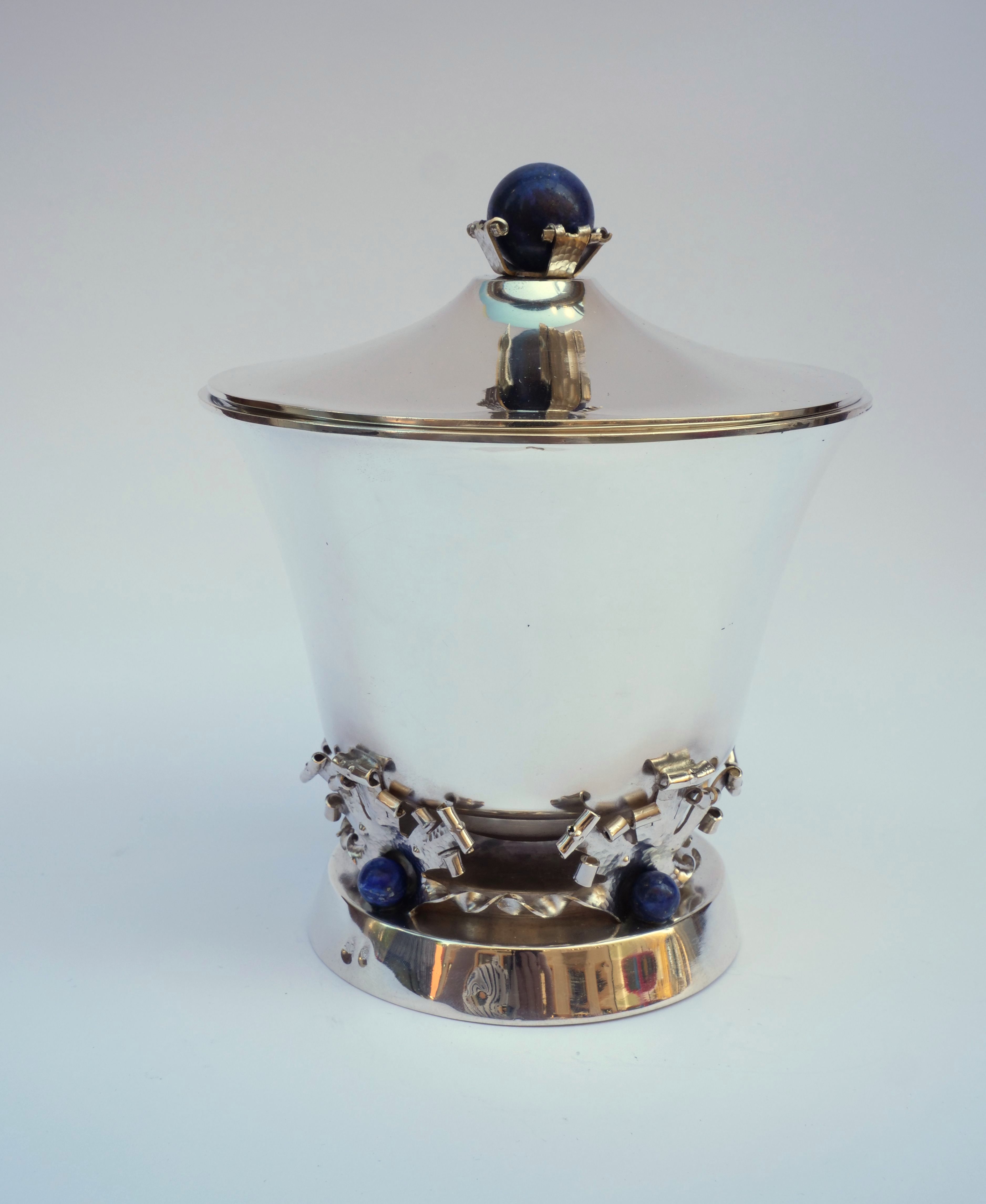 stříbrná dóza s víkem zdobená kuličkami z lapisu lazuli, btto 304,40 g Ag 900/1000, vnitřní zlacení, výška i s víkem 14,5 cm, průměr 11 cm, Španělsko, kolem r. 1935; původní dobové puncy, atest Puncovního úřadu; sběratelsky zajímavé