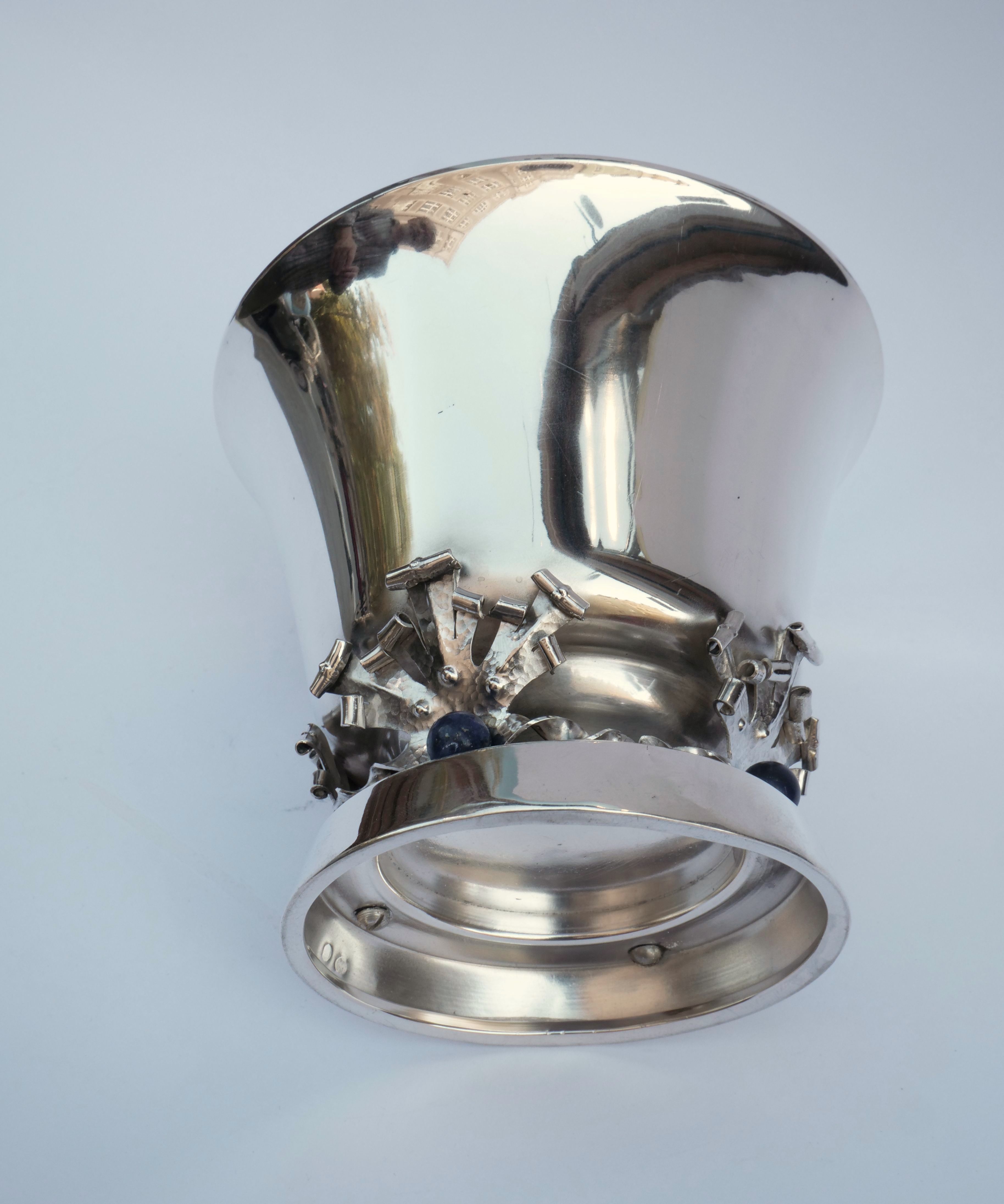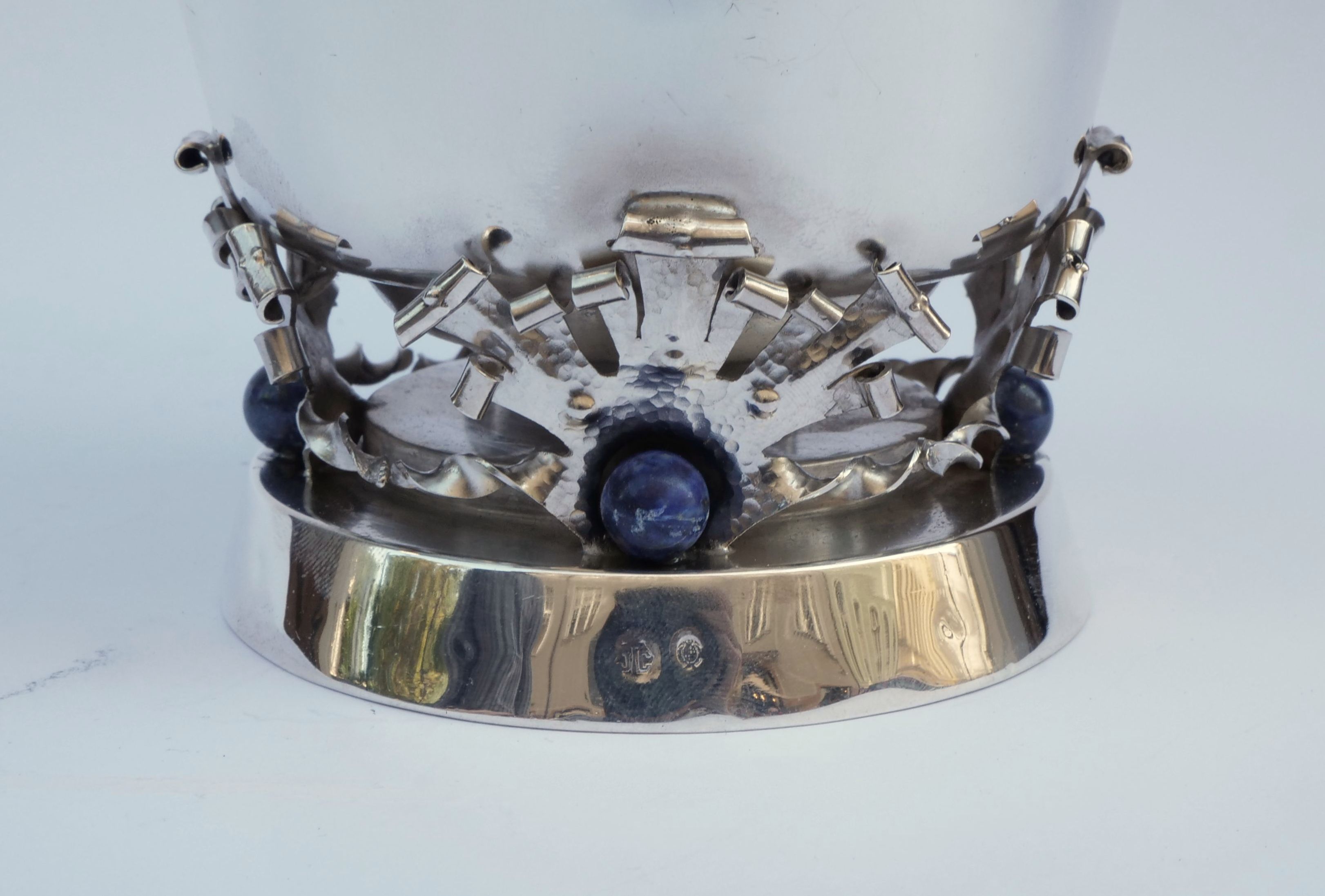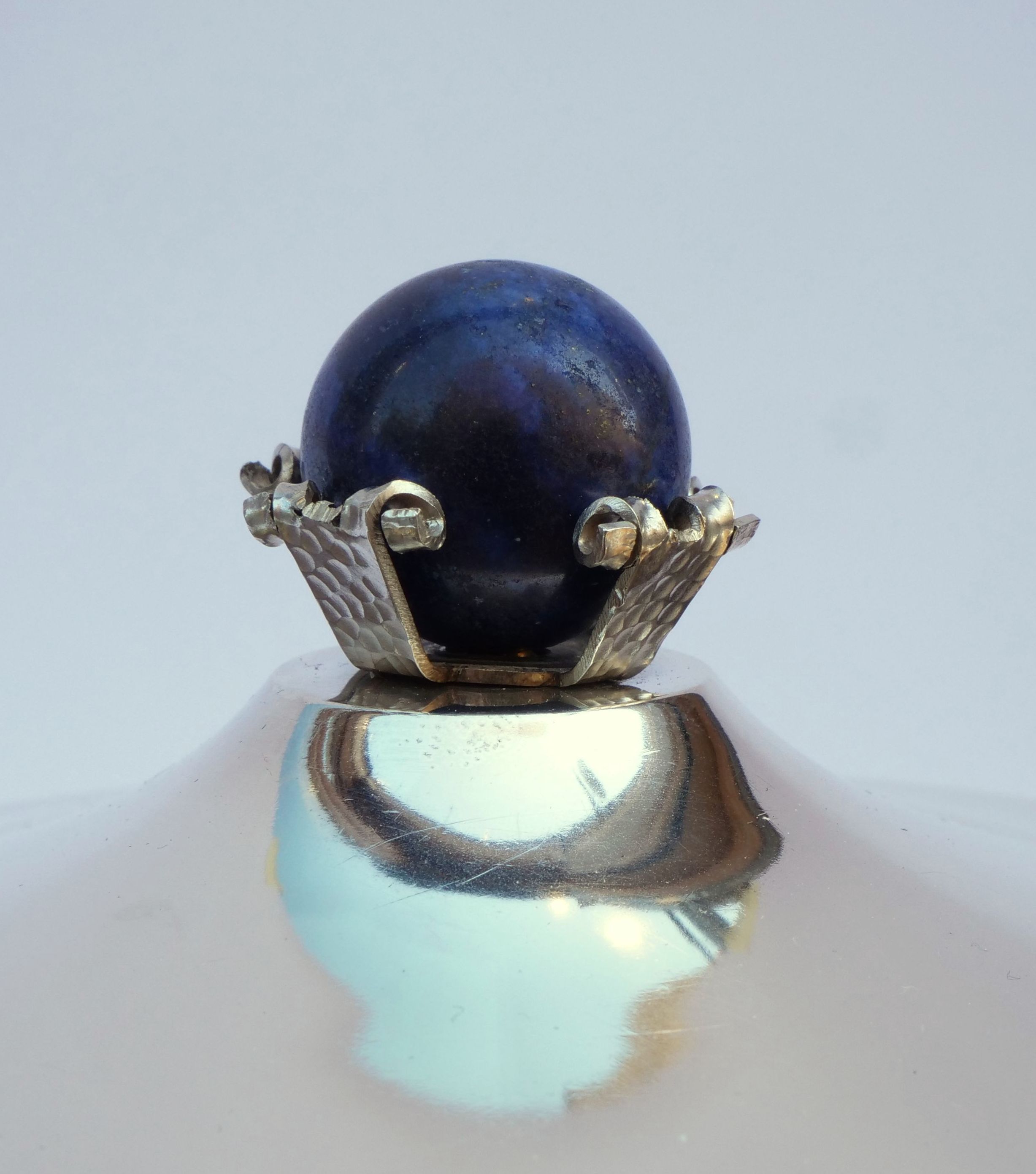 stříbrná dóza s víkem zdobená kuličkami z lapisu lazuli, btto 304,40 g Ag 900/1000, vnitřní zlacení, výška i s víkem 14,5 cm, průměr 11 cm, Španělsko, kolem r. 1935; původní dobové puncy, atest Puncovního úřadu; sběratelsky zajímavé
