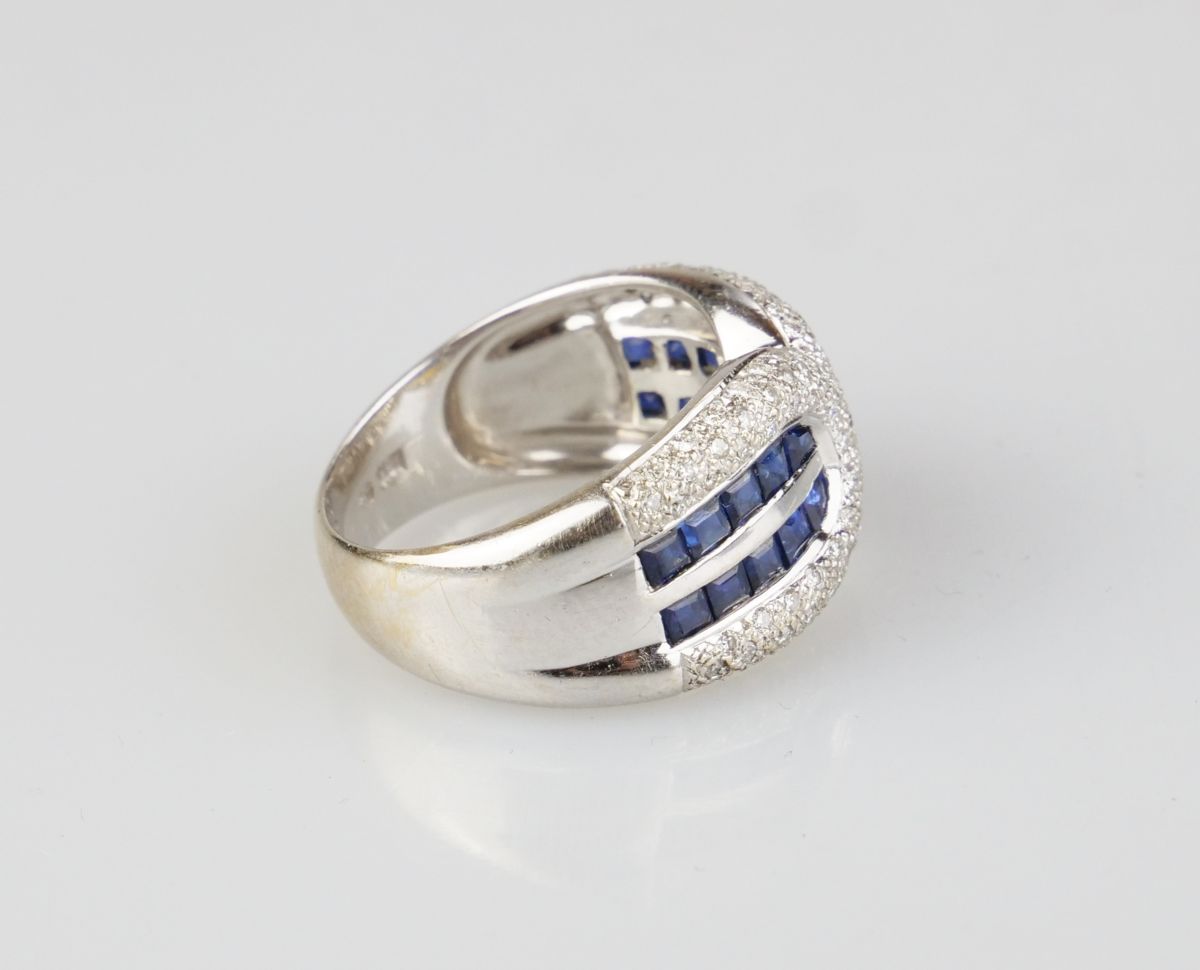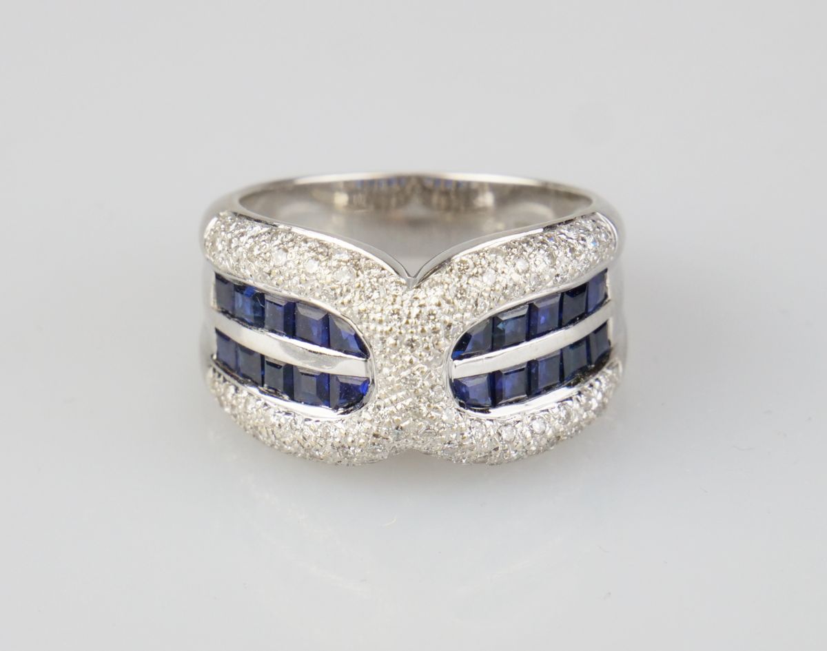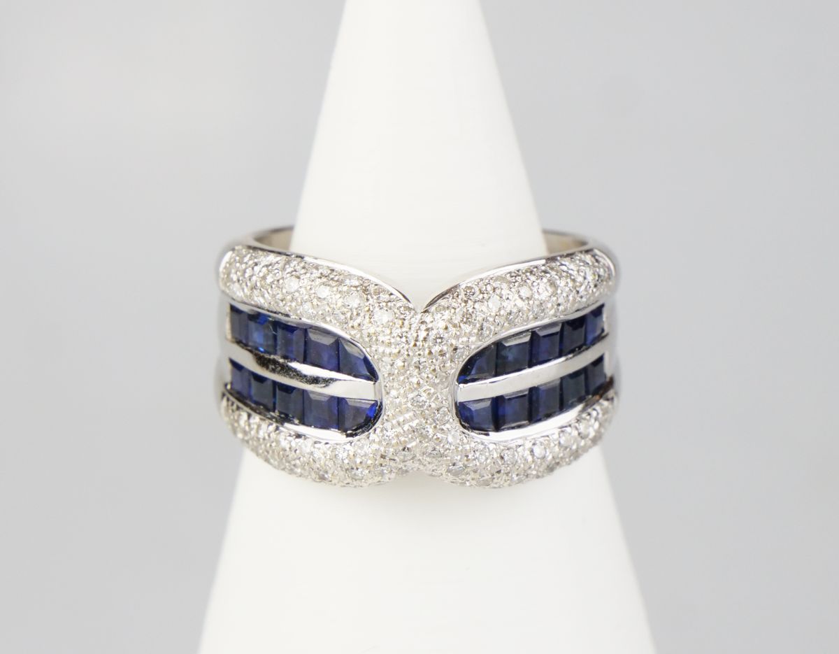 dámský prsten z bílého zlata s přírodními modrými safíry o hmotnosti 1,22 ct a diamanty briliantového brusu o hmotnosti 0,61 ct, Au 7,71g/750/1000; západní Evropa, kolem r. 1990, pozdější český punc; znalecký posudek, velikost prstenu 55