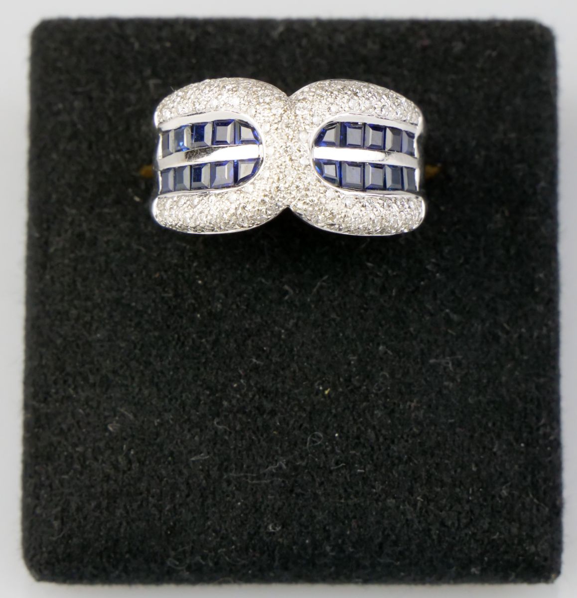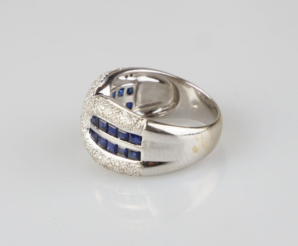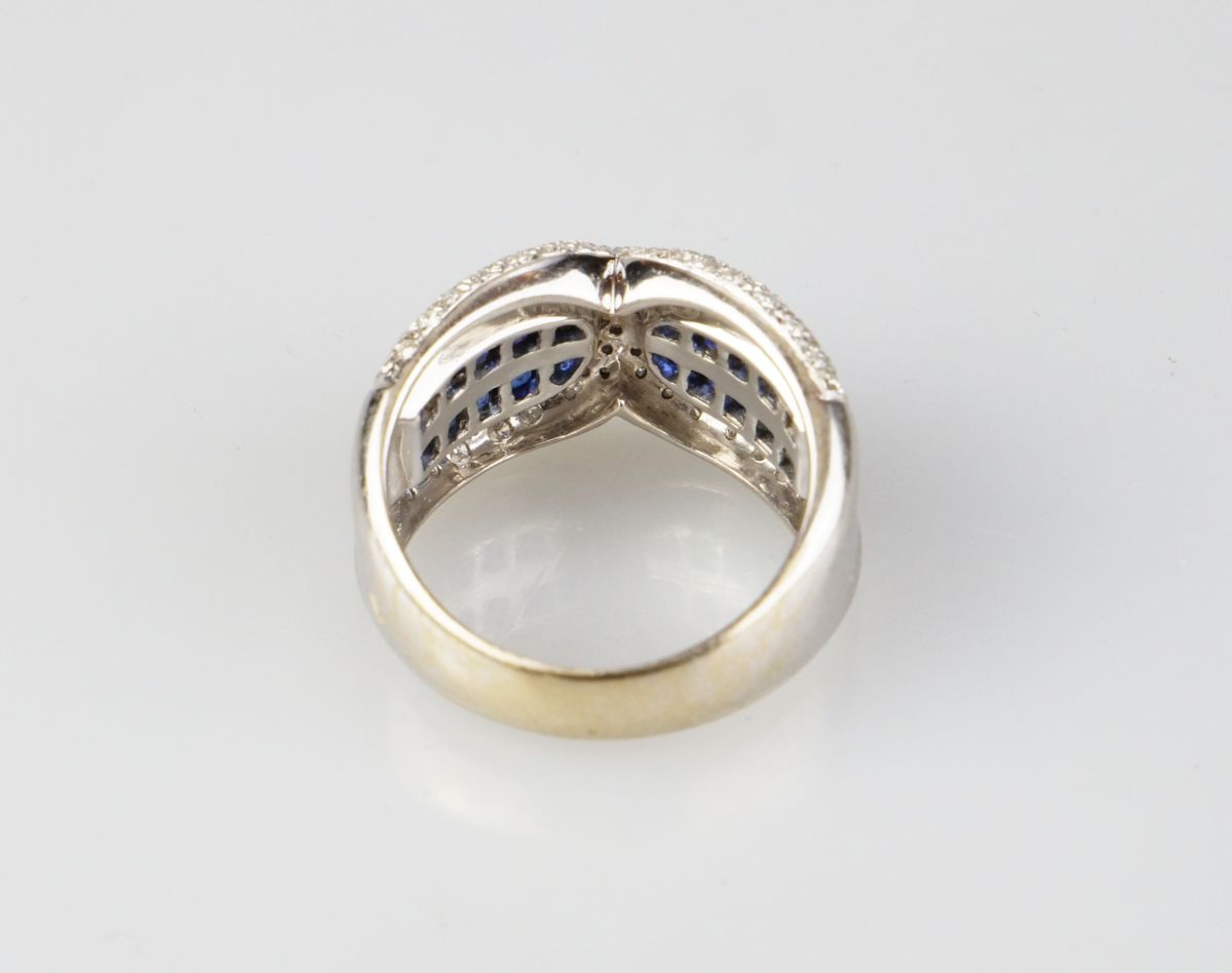 dámský prsten z bílého zlata s přírodními modrými safíry o hmotnosti 1,22 ct a diamanty briliantového brusu o hmotnosti 0,61 ct, Au 7,71g/750/1000; západní Evropa, kolem r. 1990, pozdější český punc; znalecký posudek, velikost prstenu 55