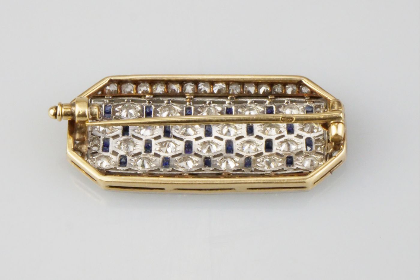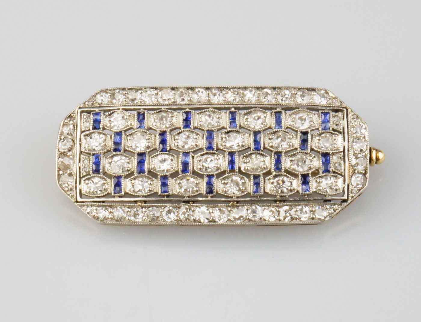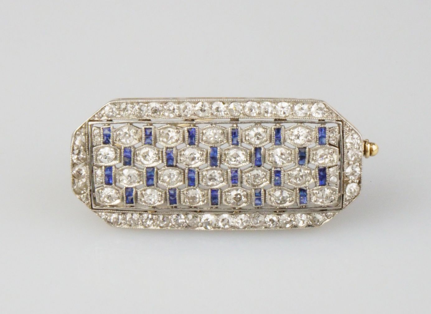 elegantní art deco brož z platiny a ze zlata, Pt+Au 6,10g/900+560/1000, diamanty briliantového brusu cca 1,4 ct a přírodní modré safíry, střední Evropa, kolem roku 1930; pěkná šperkařská práce; osvědčení Puncovního úřadu