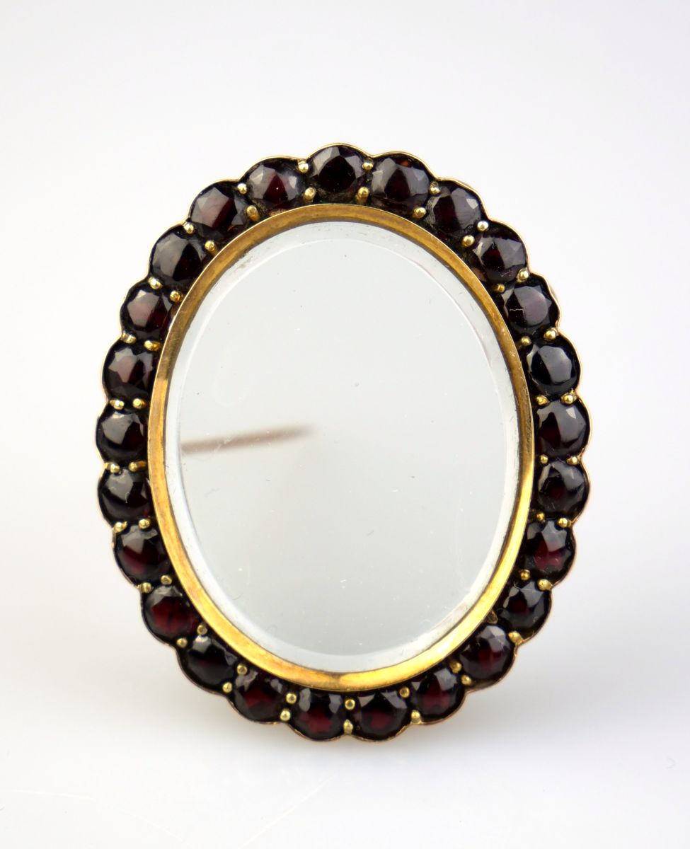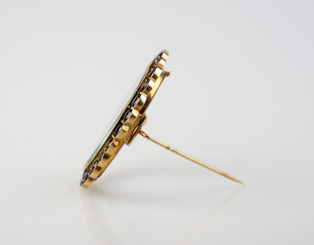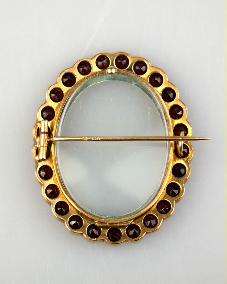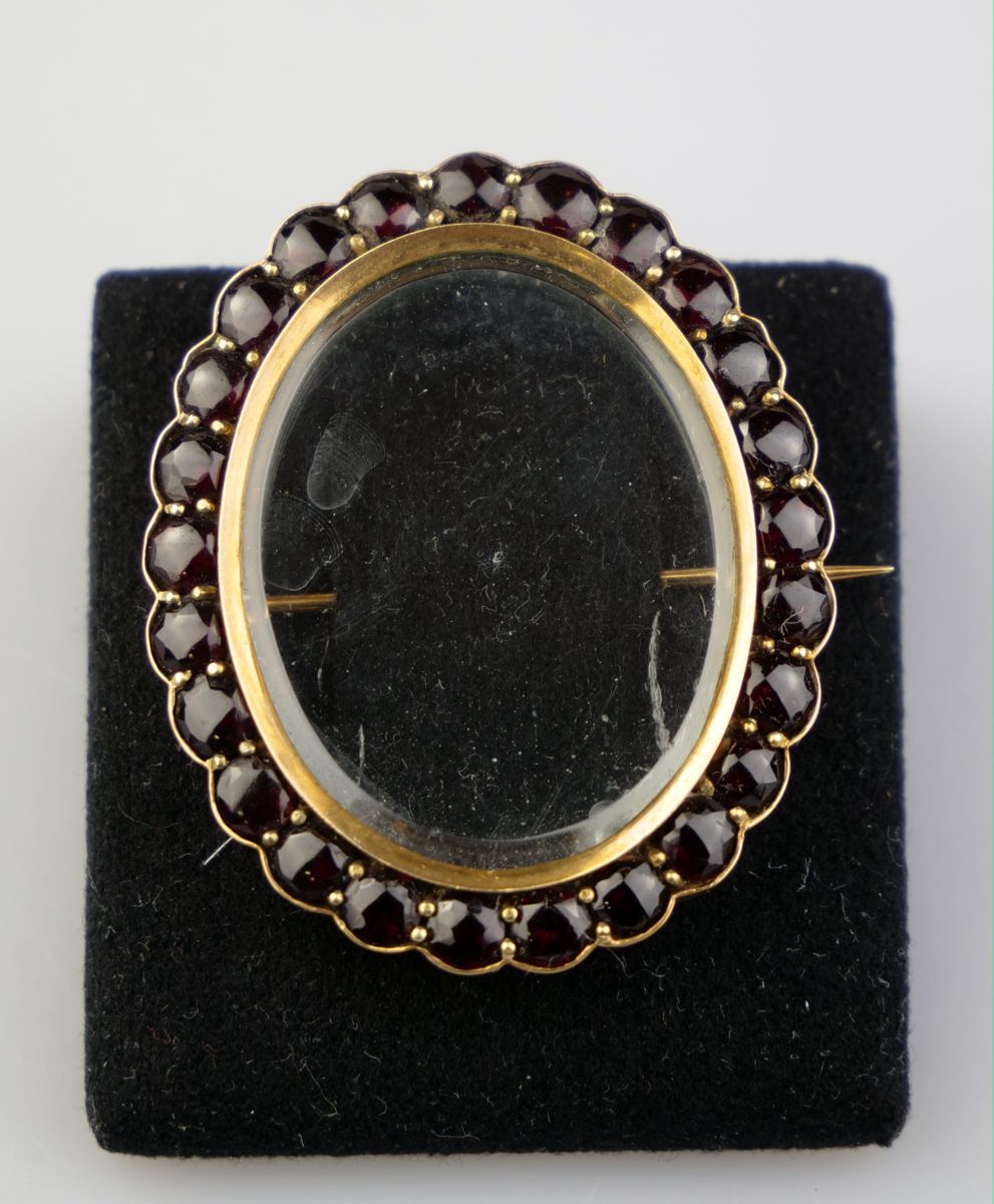zlatá brož ve tvaru oválného rámečku osazená českými granáty (pyropy), Au btto 12,90g/580/000, Rakousko - Uhersko, kolem r. 1890, značka pražského puncovního úřadu; výška 4,2 cm, šířka 3,5 cm; osvědčení Puncovního úřadu