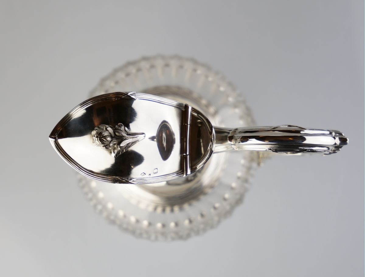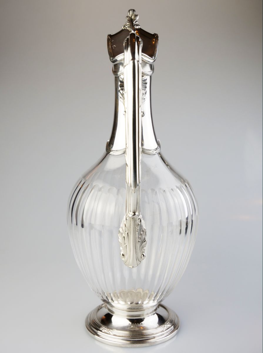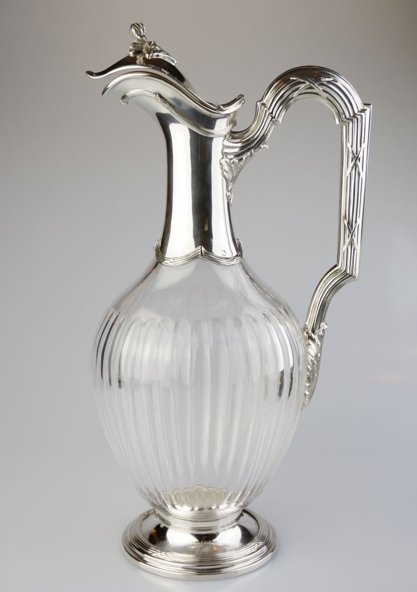 karafa na víno, čiré broušené sklo se stříbrnou montáží, Ag btto 734g/925/1000, stříbro zdobené stužkovým dekorem, Francie, kolem r. 1890, dobové francouzské puncy, pozdější český punc; výška 27 cm, průměr 11 cm