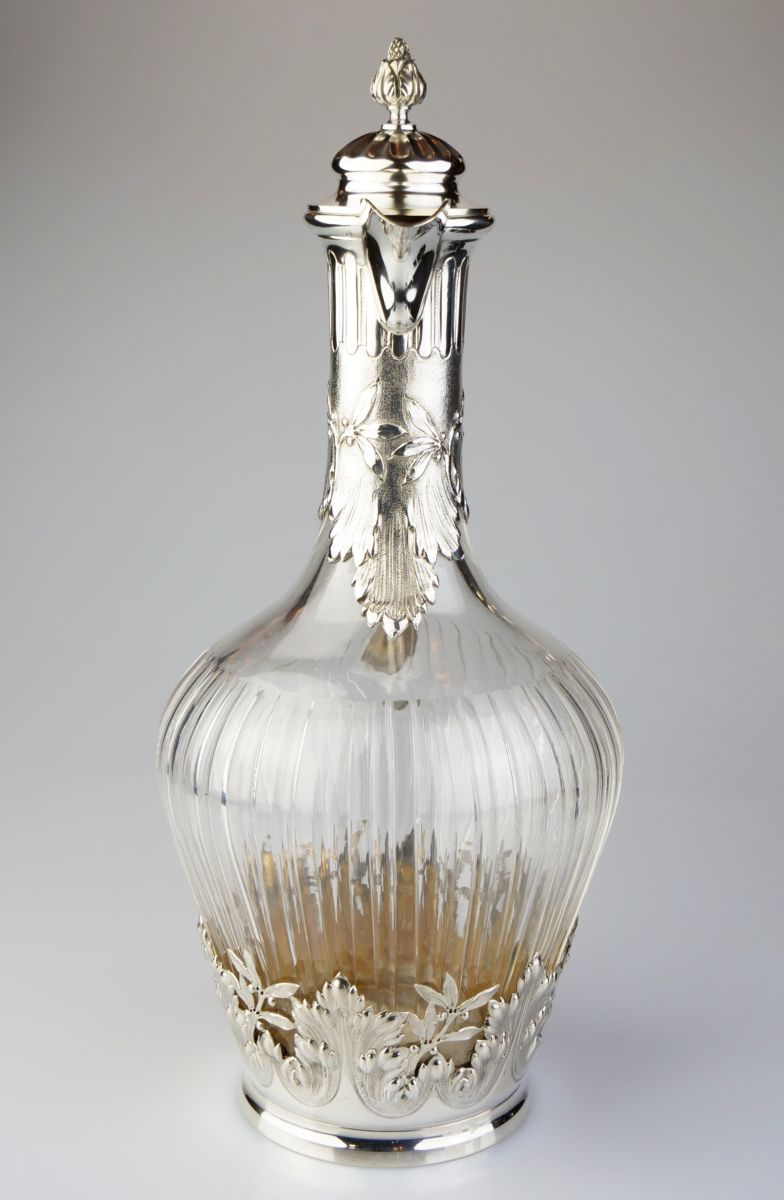 karafa na víno, čiré broušené sklo se stříbrnou montáží, Ag btto 963g/925/1000, stříbro tepané a cizelované, Francie, kolem r. 1890, dobové francouzské puncy, pozdější český punc; výška 26 cm, průměr 11,5 cm