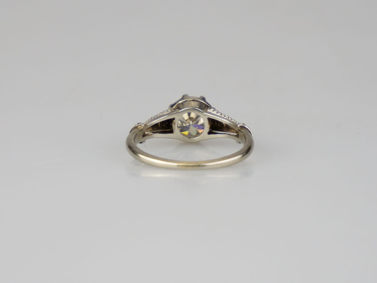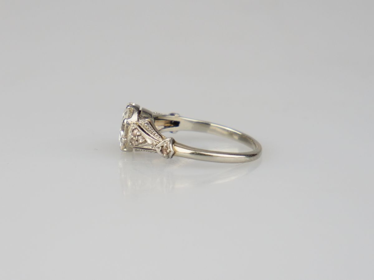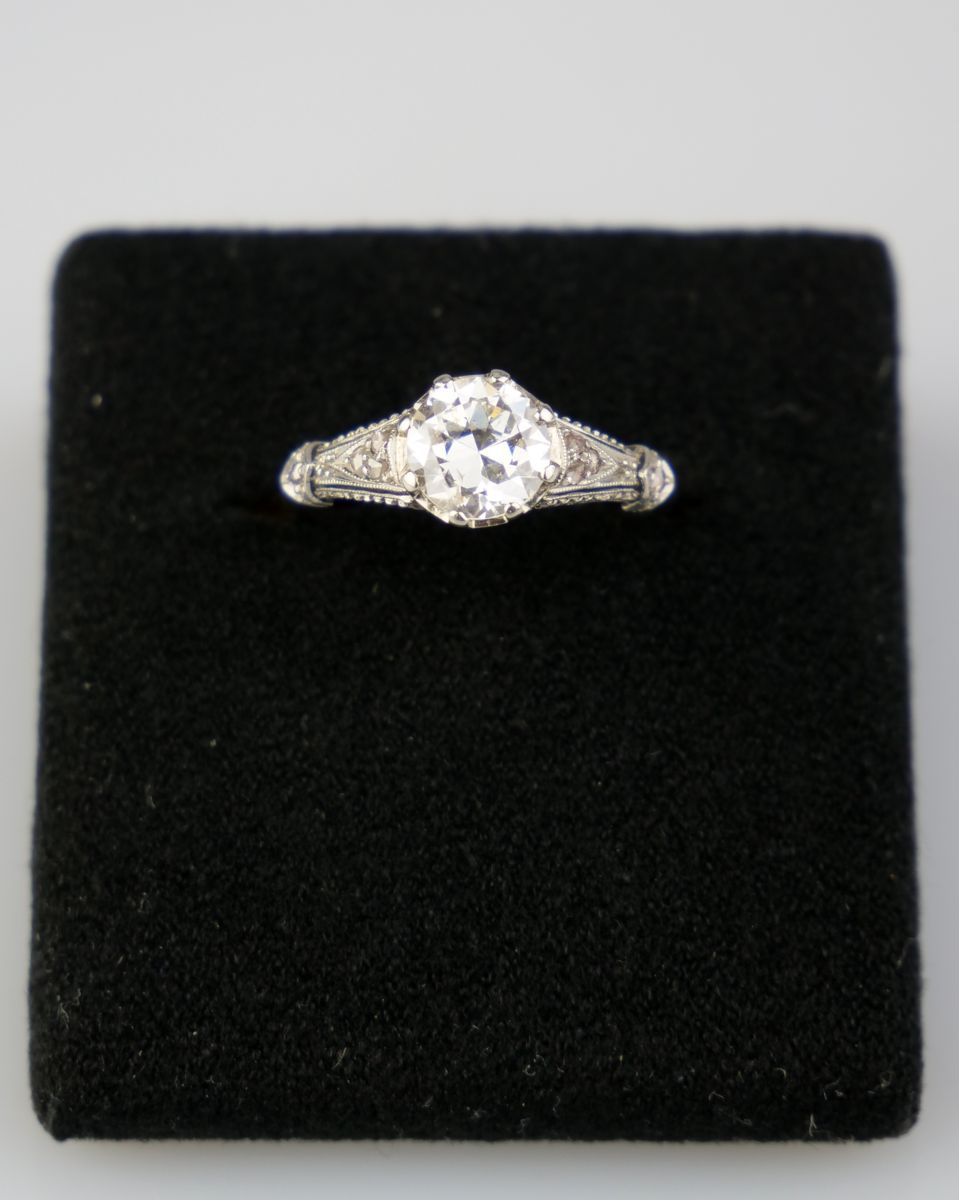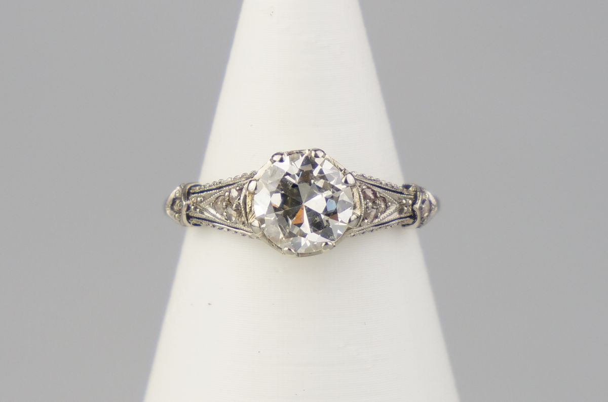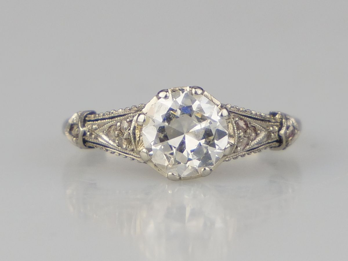 prsten z bílého zlata s diamantem staršího briliantového brusu o hmotnosti 1,05 ct v přístavcích z platiny, Au btto 2,35 g/585/1000, čistota kamene SI2, barva K-L, Československo, kolem r. 1930; znalecký posudek, atest Puncovního úřadu; velikost prstenu 50