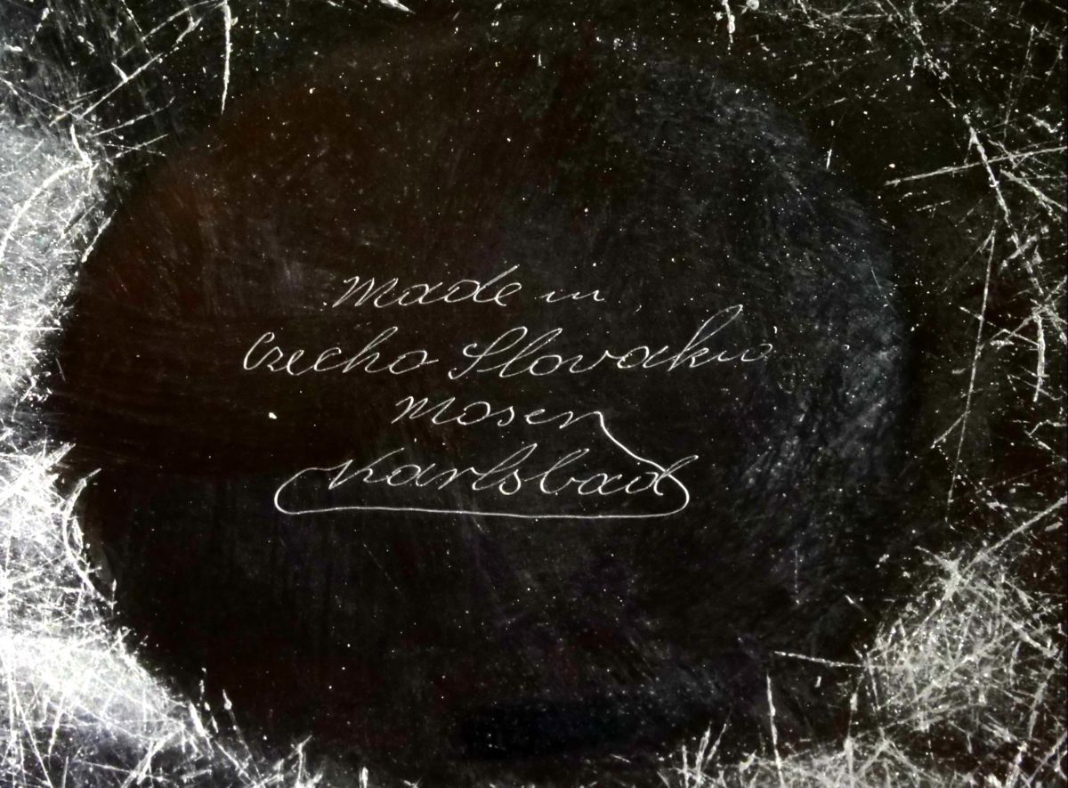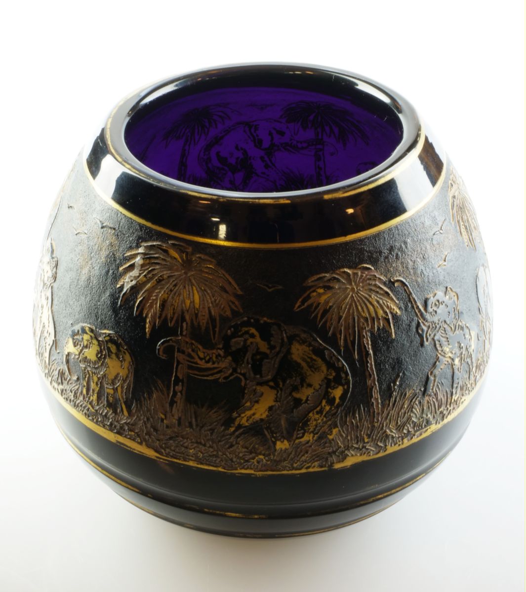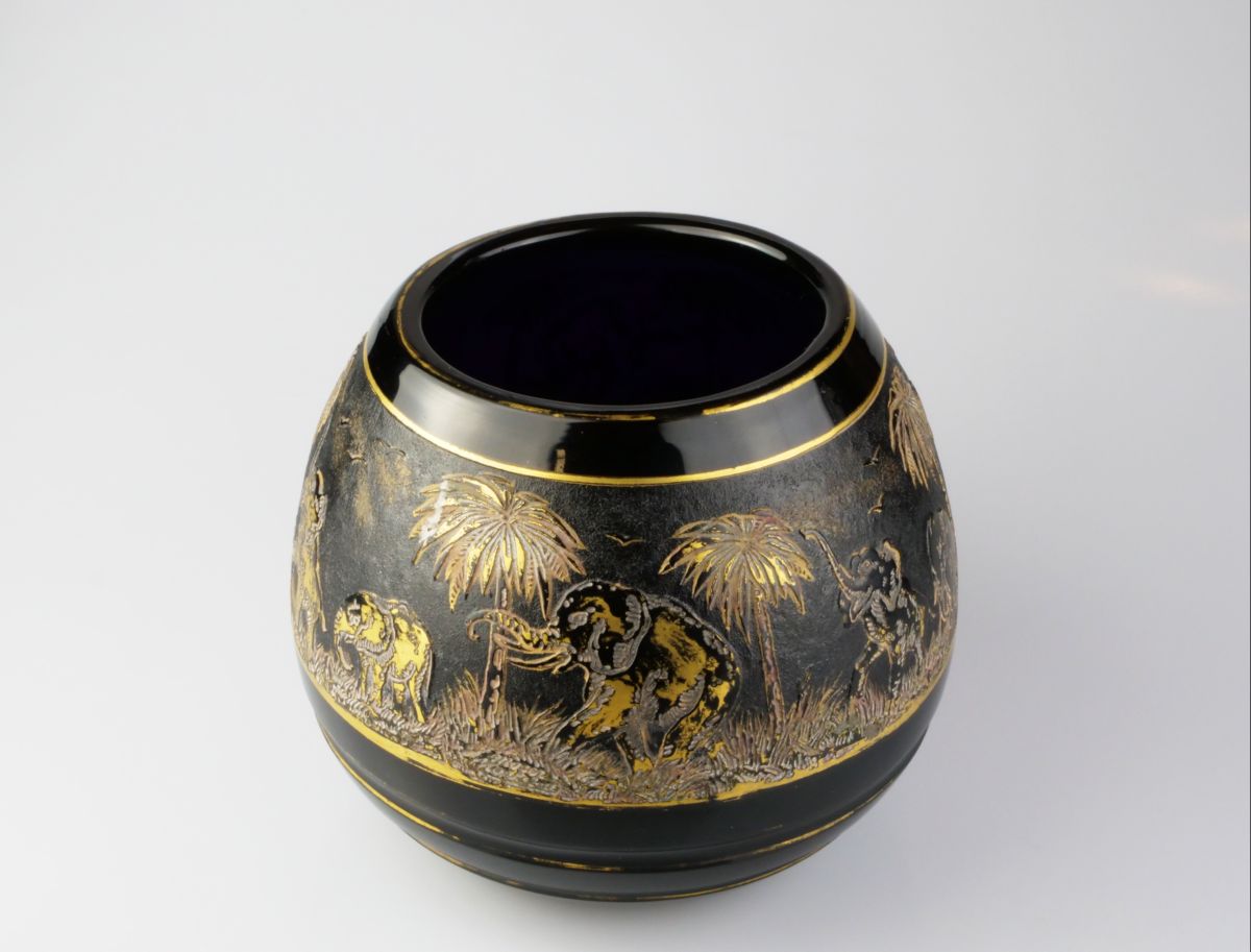 váza z tmavě ametystového skla s dekorem Animor (oroplastika se slony), sklárna Moser, Karlovy Vary, kolem r. 1926, značeno na dně i v oroplastice; průměr 14 cm, výška 12,5 cm
