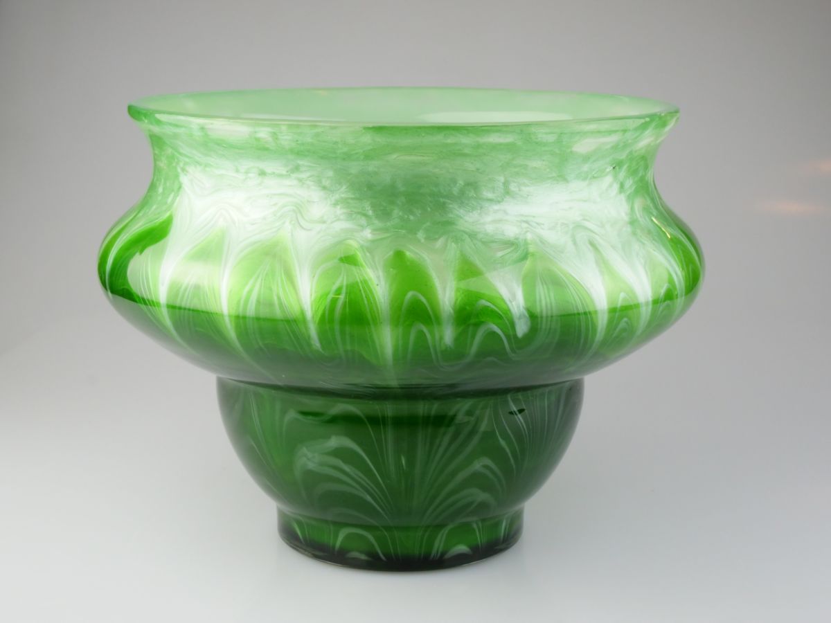 secesní tvarově zajímavá váza šumavské sklárny Loetz z Klášterského Mlýna, nadčasový dekor Titania, Rakousko-Uhersko (Čechy), kolem r. 1907; výška 13,5 cm, průměr 18,5 cm; sběratelsky zajímavé