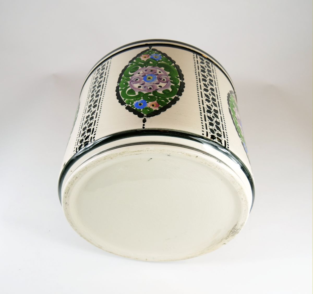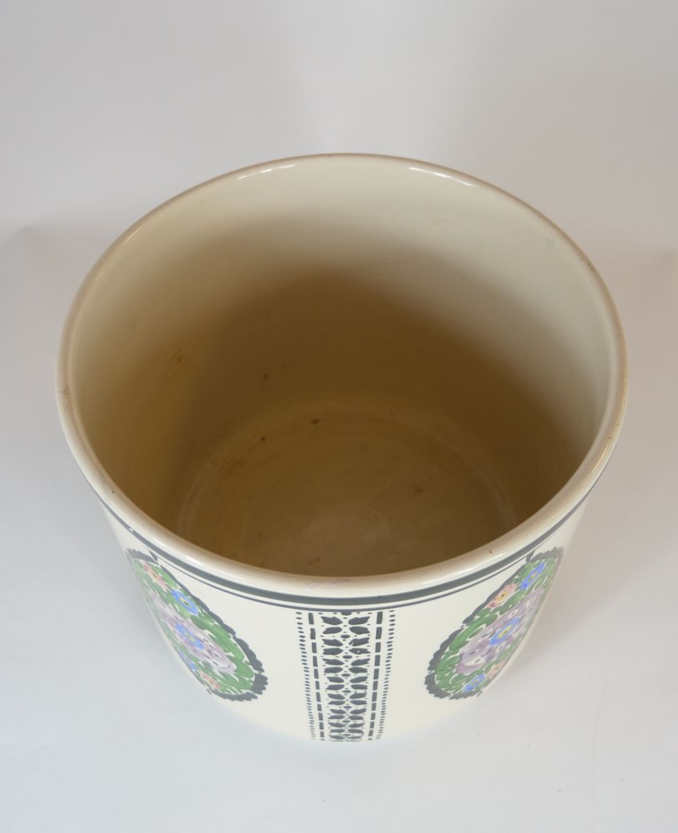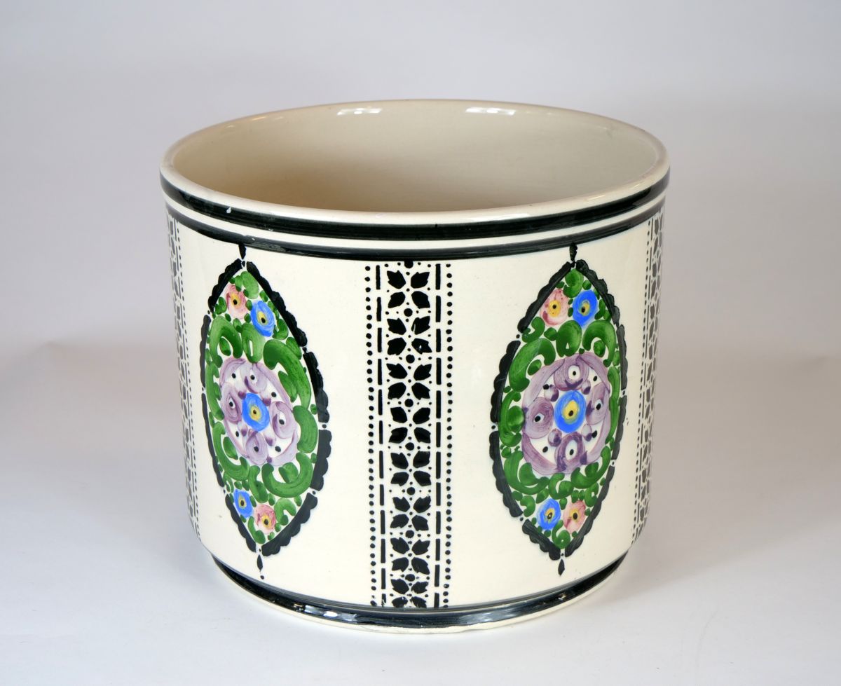 velkorozměrný art deco květináč z kameniny, malovaný květinový dekor v kombinaci s černým šablonovým nástřikem, drobné stopy času a používání, západní Čechy, kolem r. 1920; výška 26 cm, průměr 31 cm