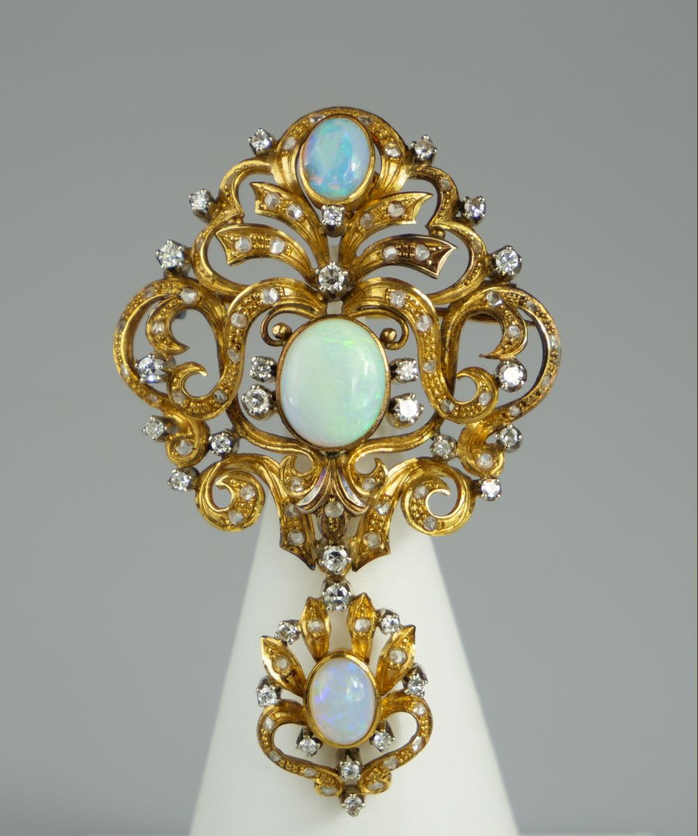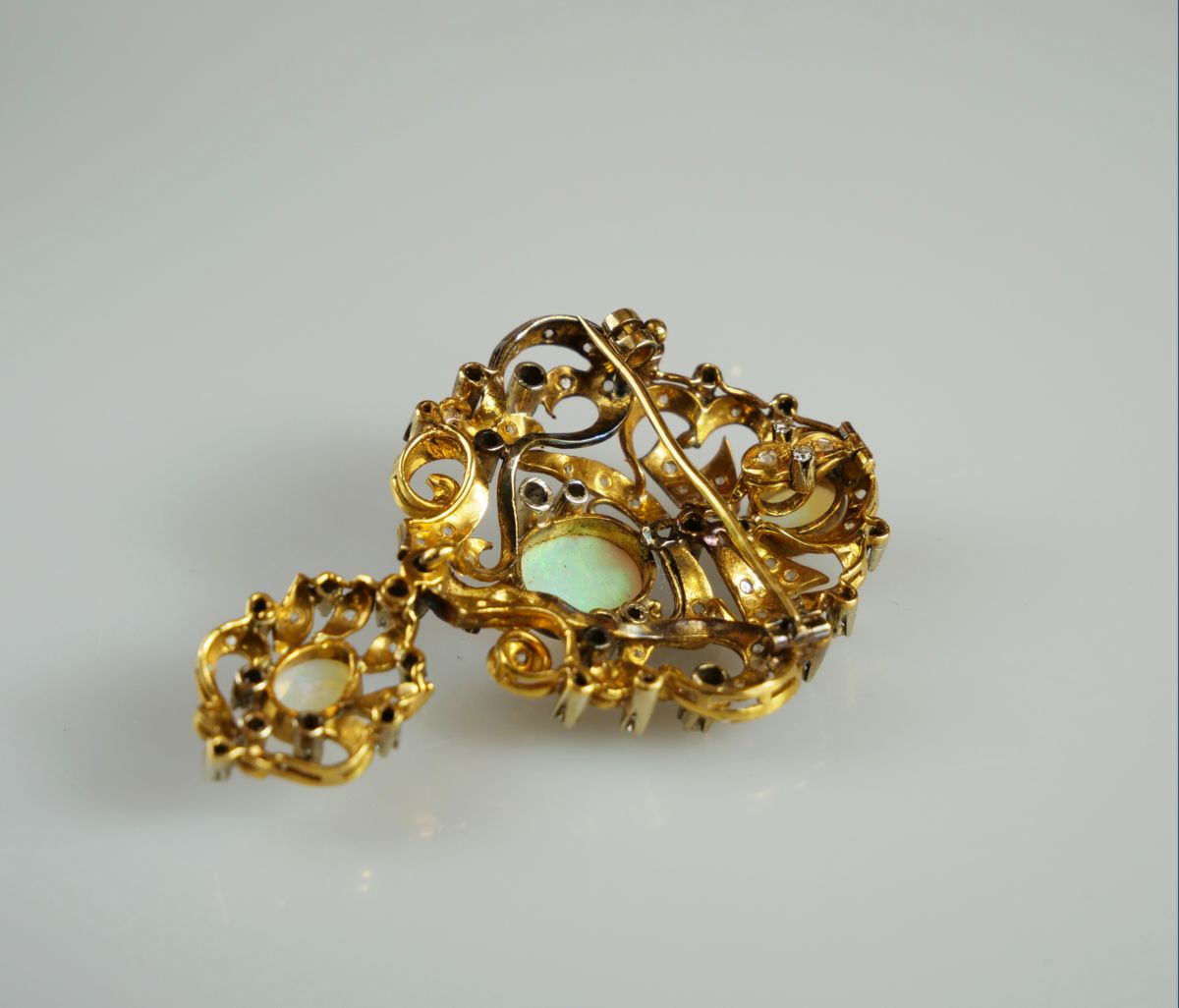 mohutný zlatý neobarokní závěs s opály a diamanty, provedený zároveň jako brož, celková hmotnost diamantů briliantového brusu je cca 0,75 ct + routy, Au btto 21,60g/750/1000, západní Evropa, kolem r. 1920; atest Puncovního úřadu; rozměry 6,5 x 4,3 x 1,5 cm; krásná šperkařská práce