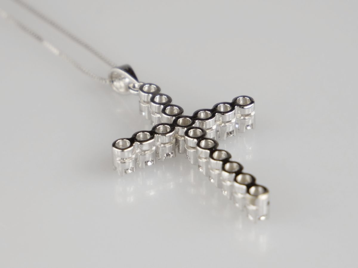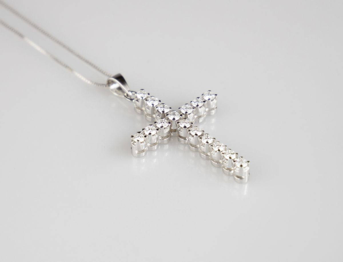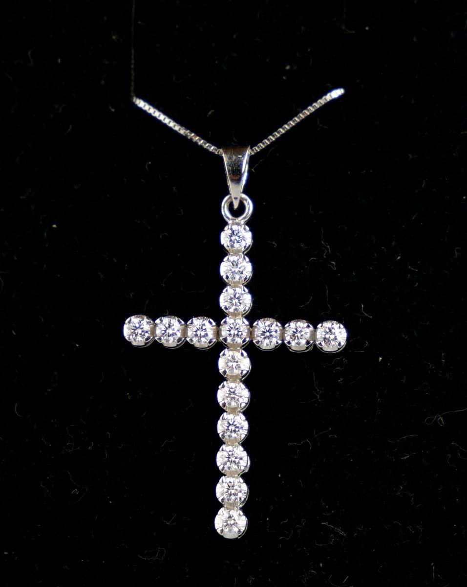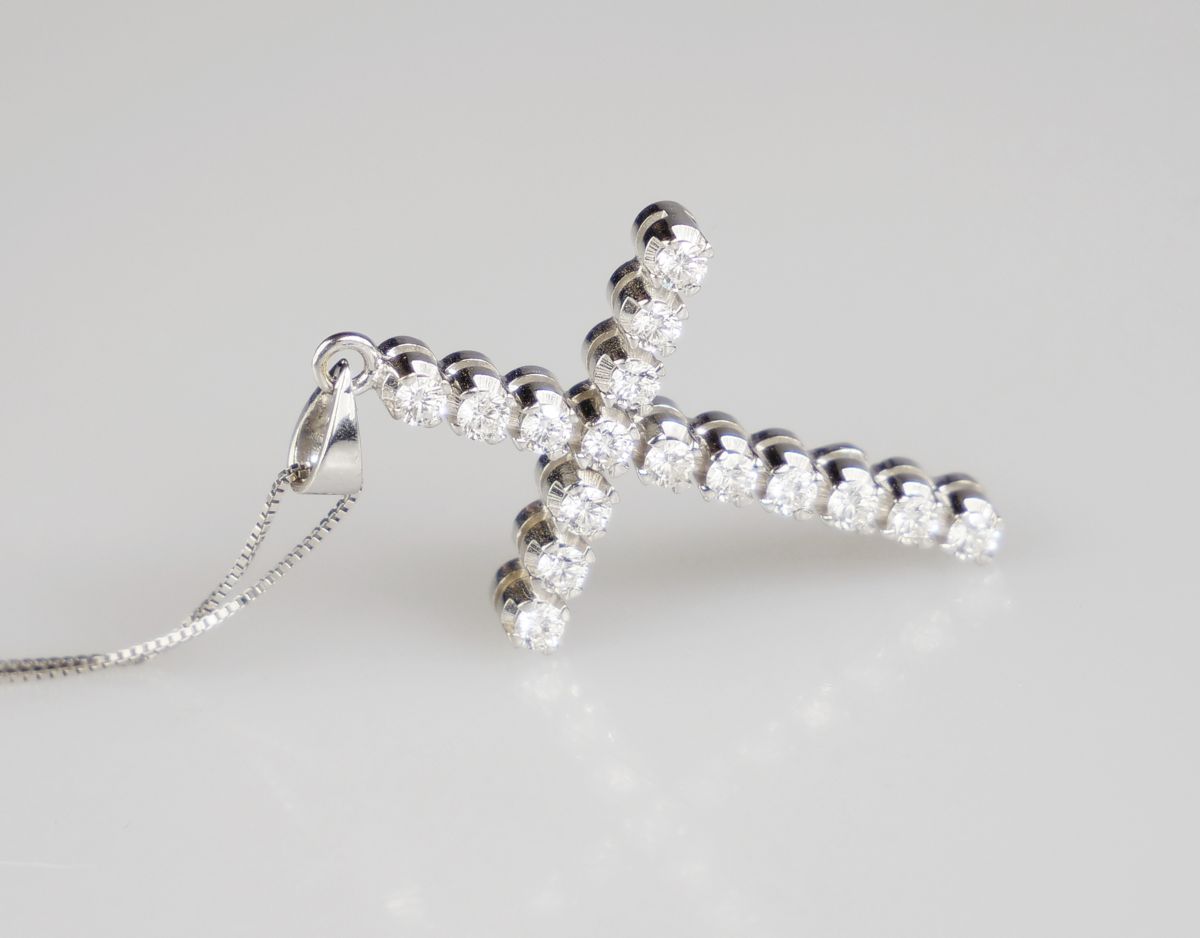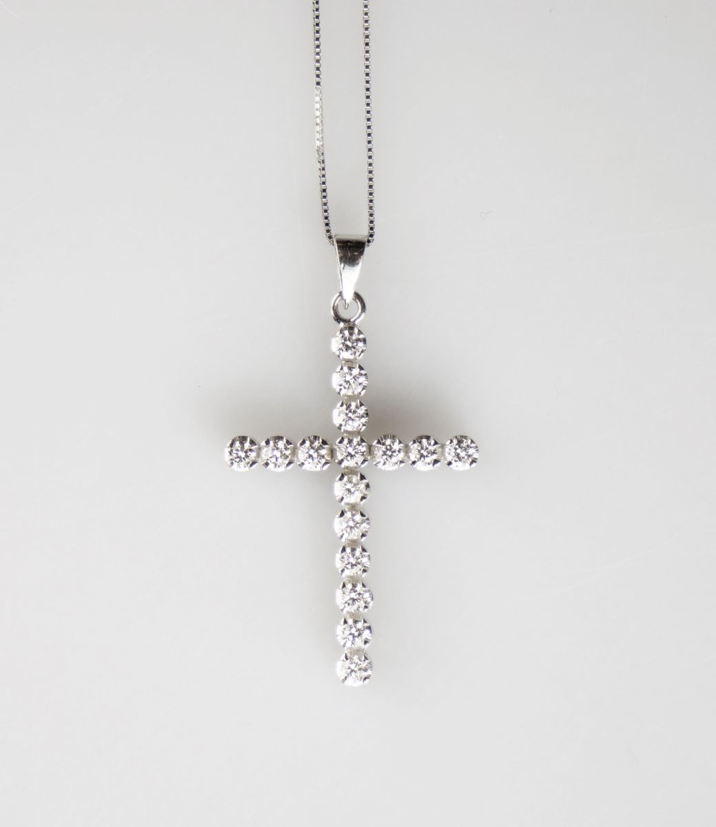 zlatý křížek s řetízkem, diamanty briliantového brusu o celkové hmotnosti cca 0,8 ct, Au 4,44 g/750/1000, Itálie, kolem r. 1995, pozdější česká puncovní značka (kohout); rozměr 3,5 x 2 cm