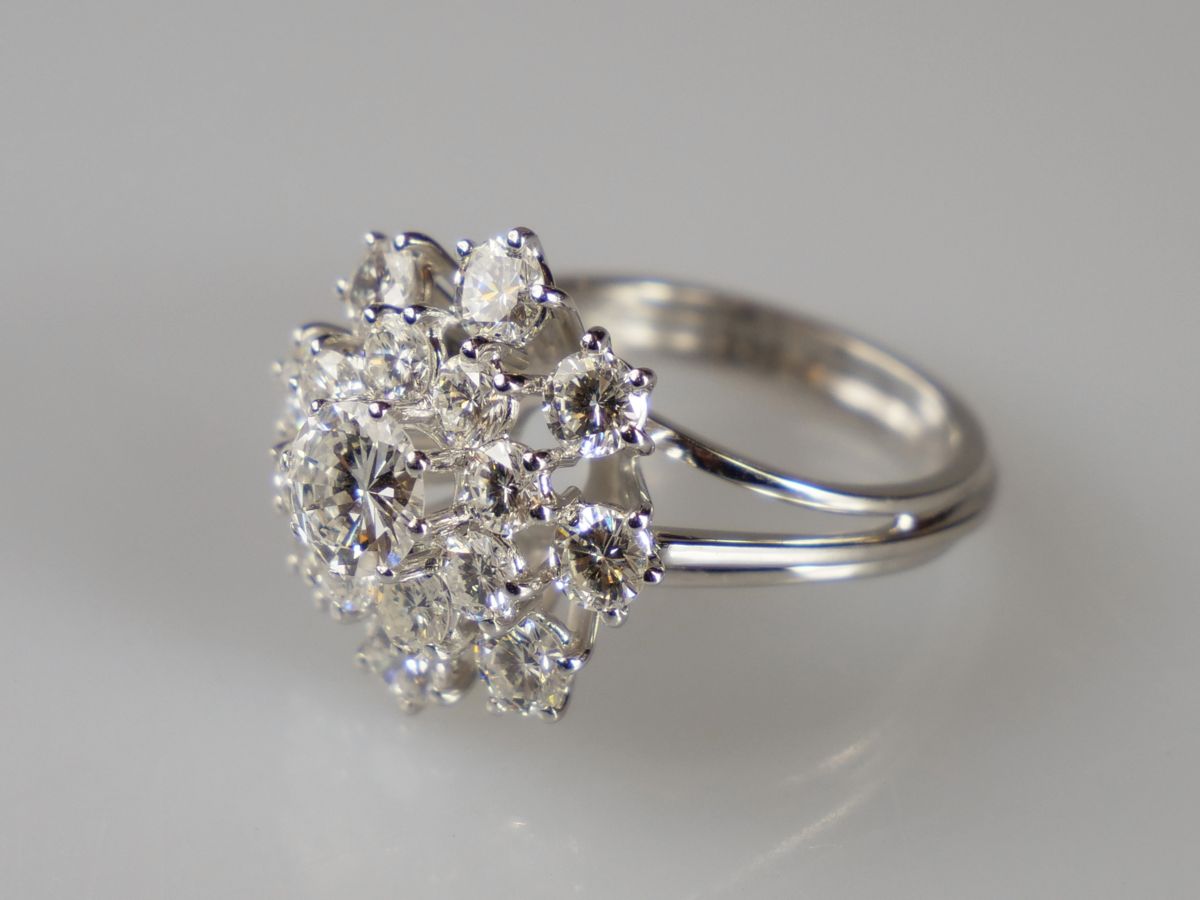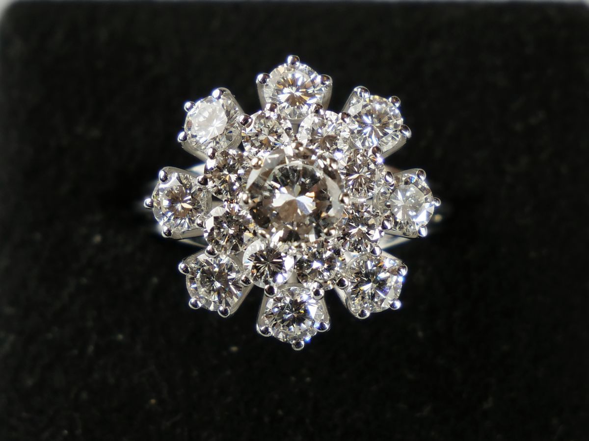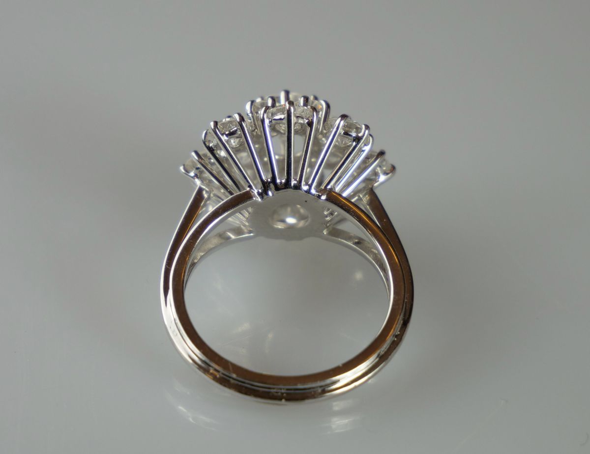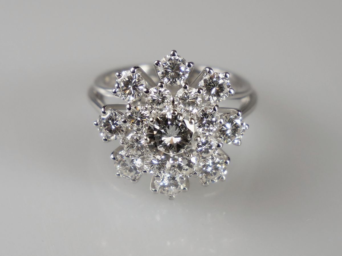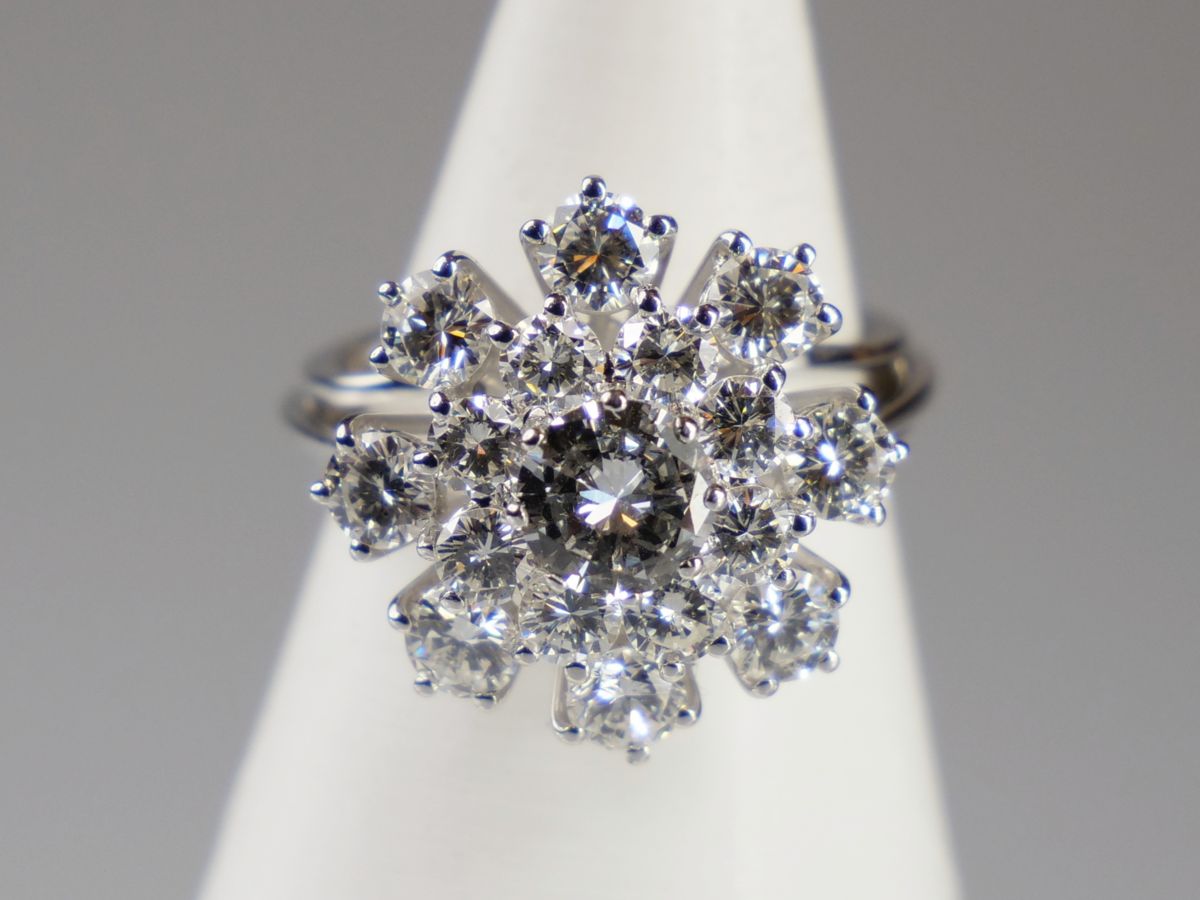 zlatý prsten ve tvaru sněhové vločky s diamanty, hmotnost centrálního diamantu briliantového brusu je přibližně 0,75 ct, barva výjimečná vzácná bílá E-F (!) čistota IF (!), dále je na prstenu 16 ks diamantů briliantového brusu o celkové hmotnosti cca 2,4 ct (dohromady 3,15 ct), Au btto 6,43 g/750/1000, západní Evropa, kolem r. 1995, pozdější česká puncovní značka (labuť); znalecký posudek; rozměry 3,01 x 2,13 x 1,85 cm; velikost prstenu 54