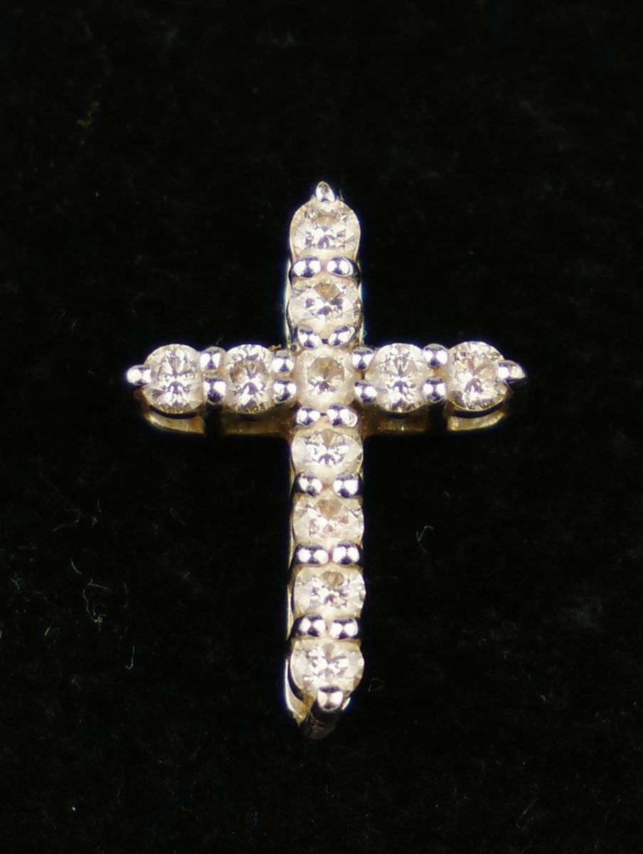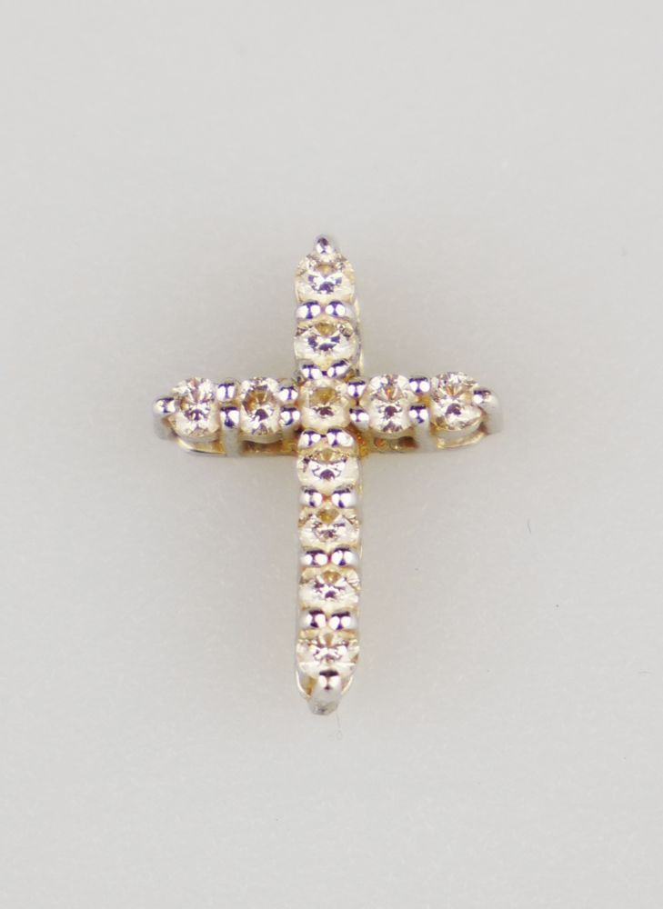 drobný křížek z bílého zlata s diamanty briliantového brusu o celkové hmotnosti cca 0,2 ct, Au btto 0,82 g/585/1000, Evropa, kolem r. 2000, pozdější česká puncovní značka (labuť); rozměr 1,4 x 1 cm