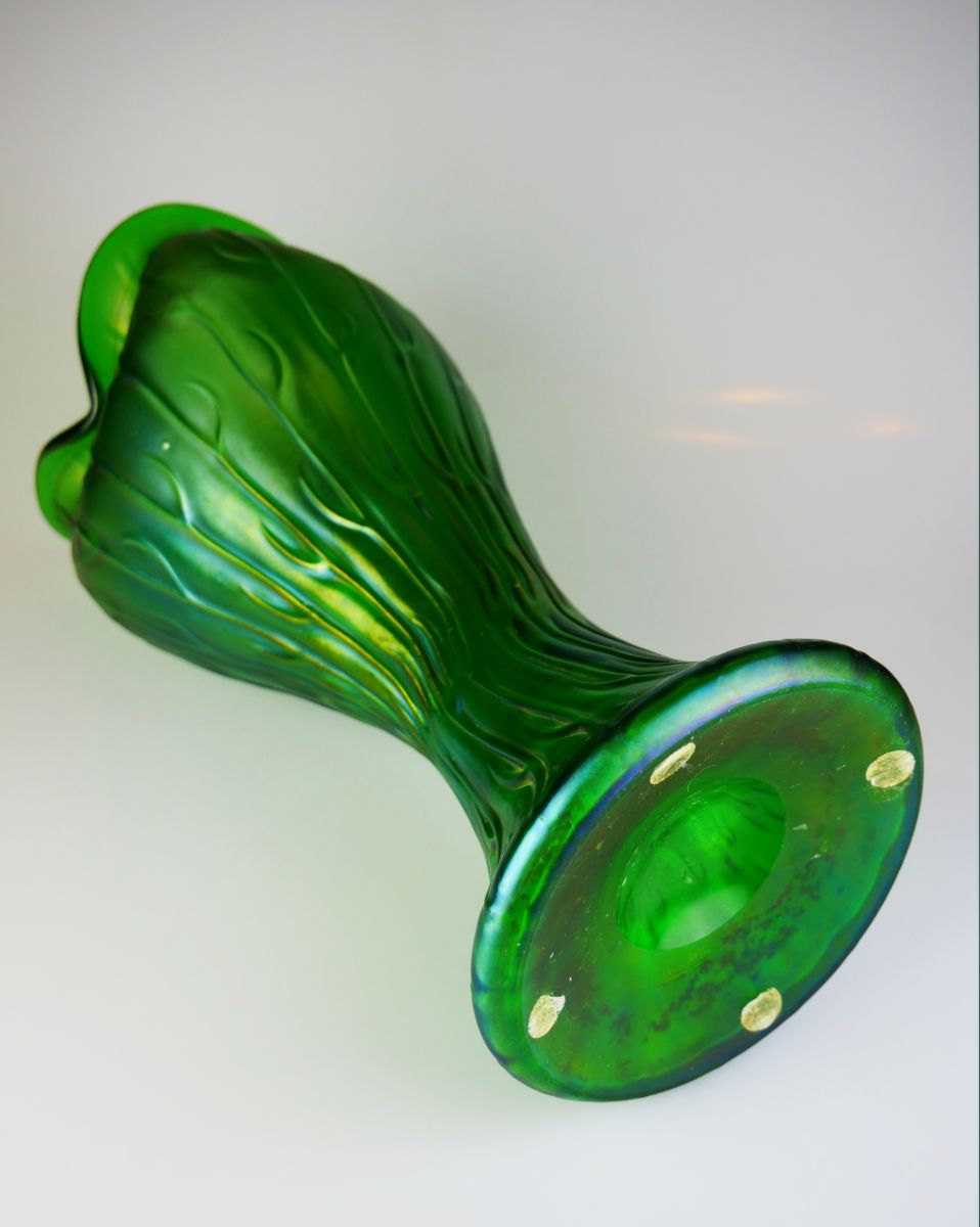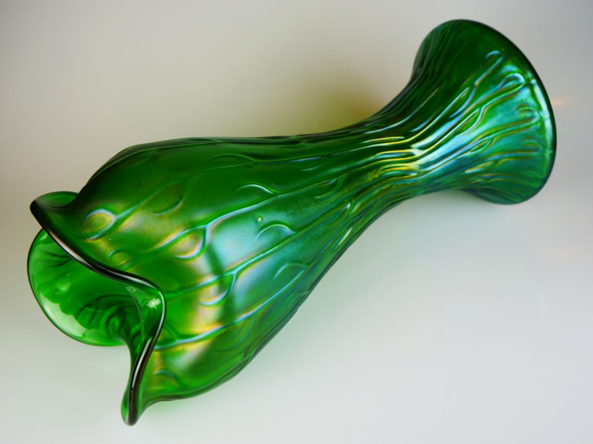 secesní váza šumavské sklárny Loetz z Klášterského Mlýna, dekor creta Neptun, Rakousko - Uhersko, Čechy, kolem r. 1905; výška 30,5, průměr 12,5