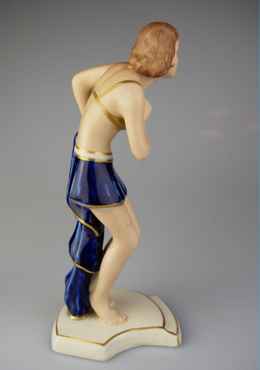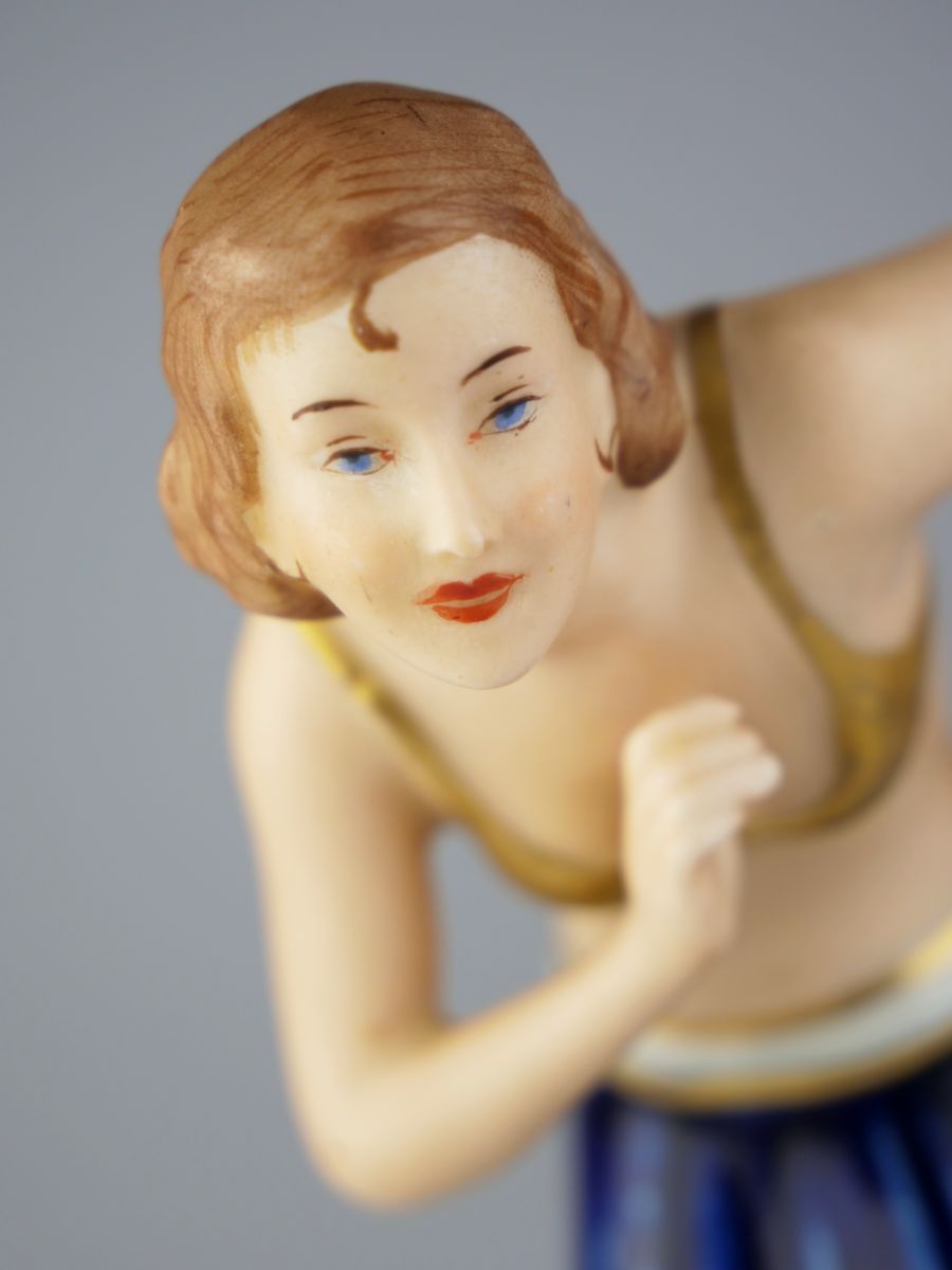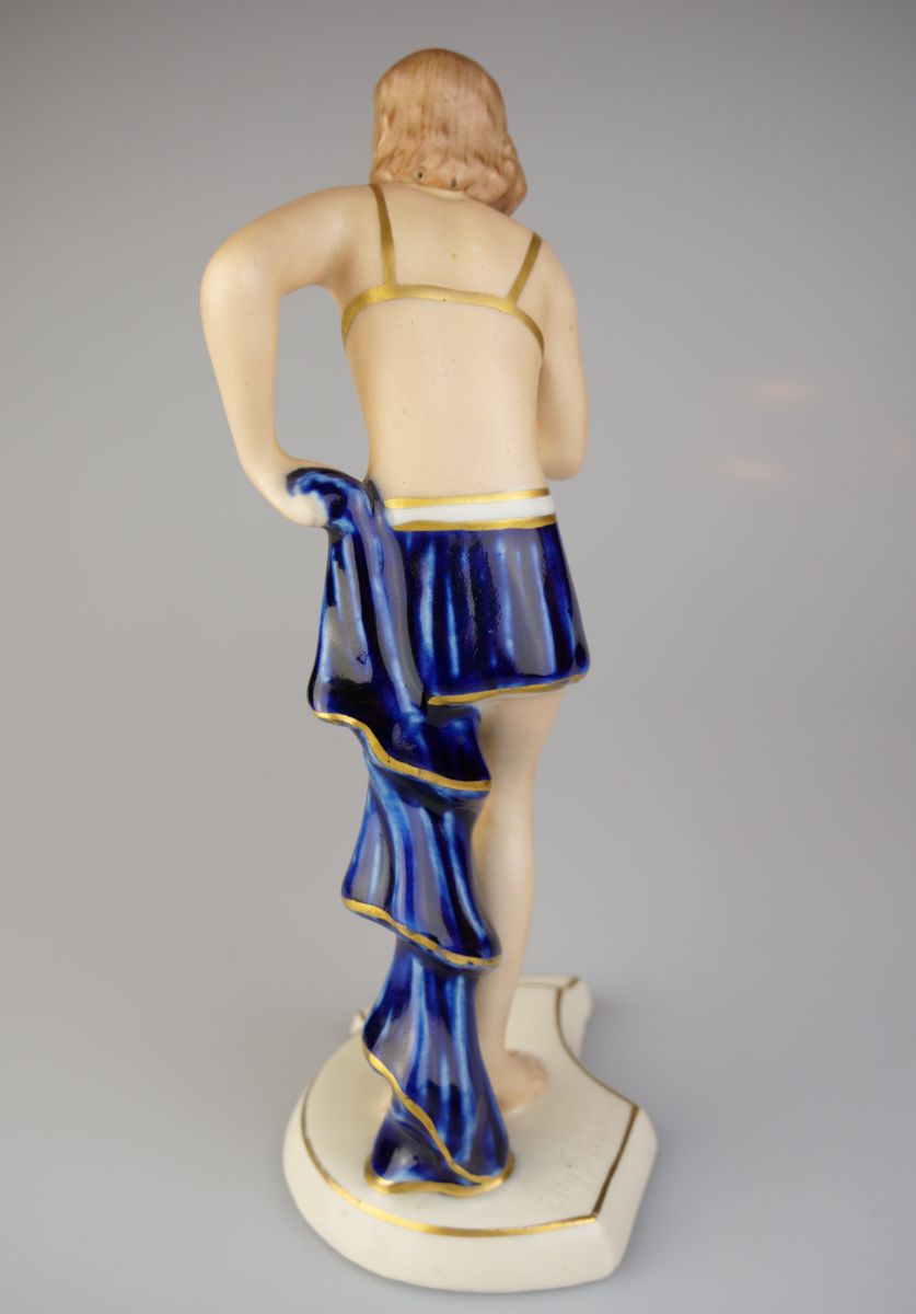 art deco soška tanečnice z kolorovaného biskvitu s kobaltově modrou glazovanou sukní, vyrobila duchcovská manufaktura Royal Dux, návrh Elly Strobach, Čechy, kolem r. 1930, výška 18 cm; signováno modelérkou, značeno; drobná výrobní vada