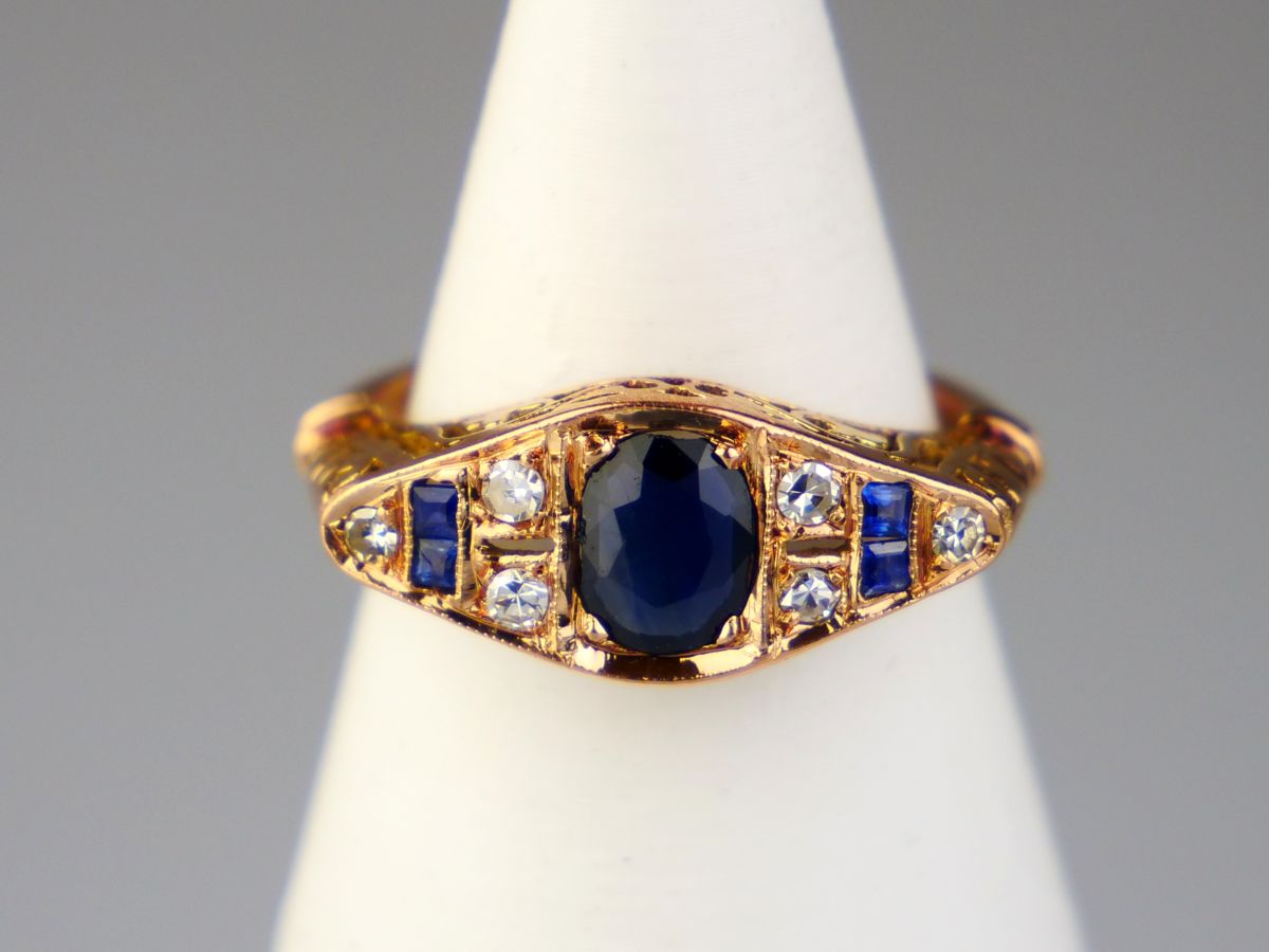 zlatý prsten s přírodními safíry a diamanty jednoduchého briliantového brusu o hmotnosti cca 0,12 ct, Au btto 2,81 g/500/1000, hlava prstenu lodičkového tvaru ozdobně prořezávaná, západní Evropa, kolem r 1935, atest Puncovního úřadu; rozměr hlavy 2 x 0,9 cm, velikost prstenu 53,5