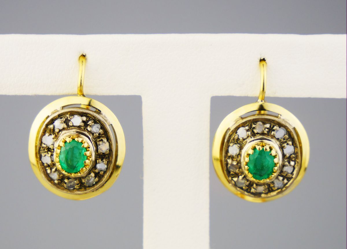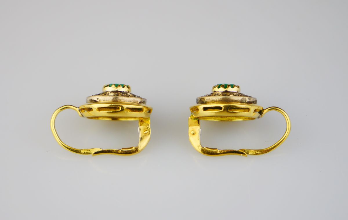 zlaté náušnice se smaragdy a diamantovými routami, Au btto 7,25 g/750/1000, západní Evropa, kolem r. 1970, atest Puncovního úřadu; rozměr 2,2 x 1,5 cm