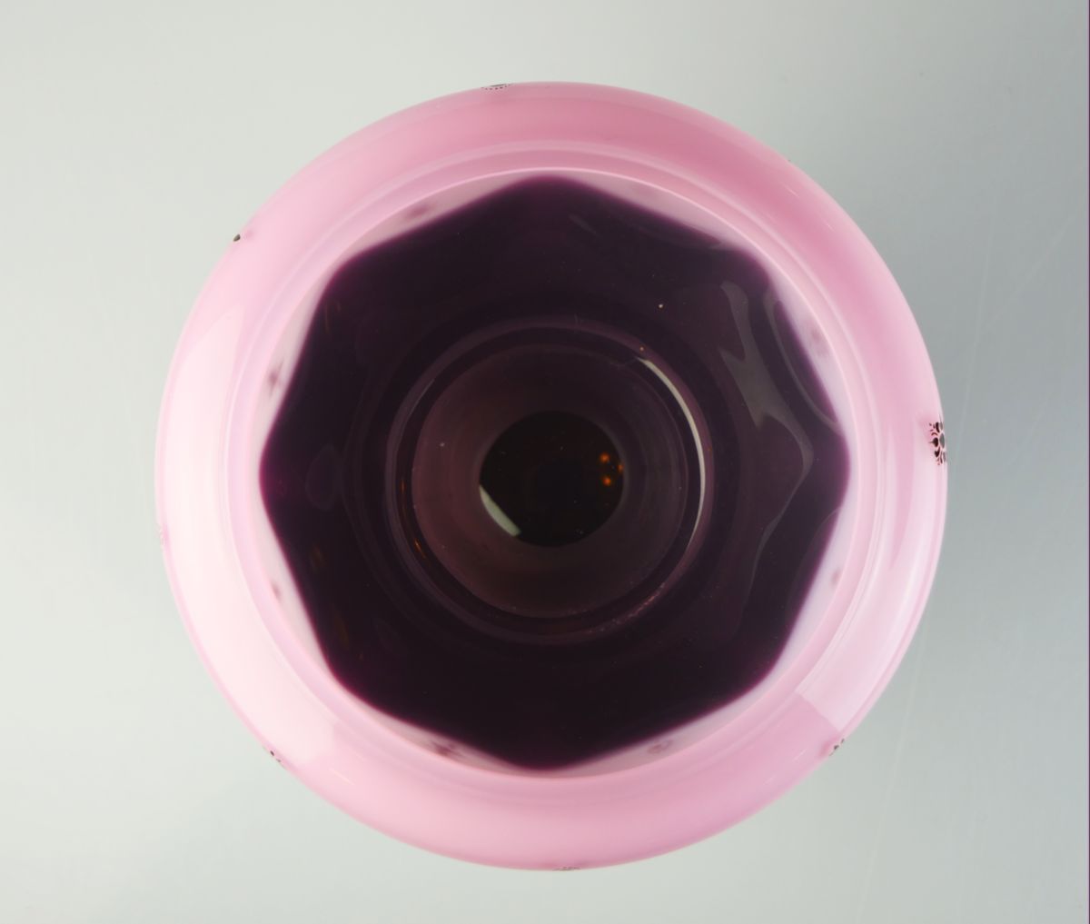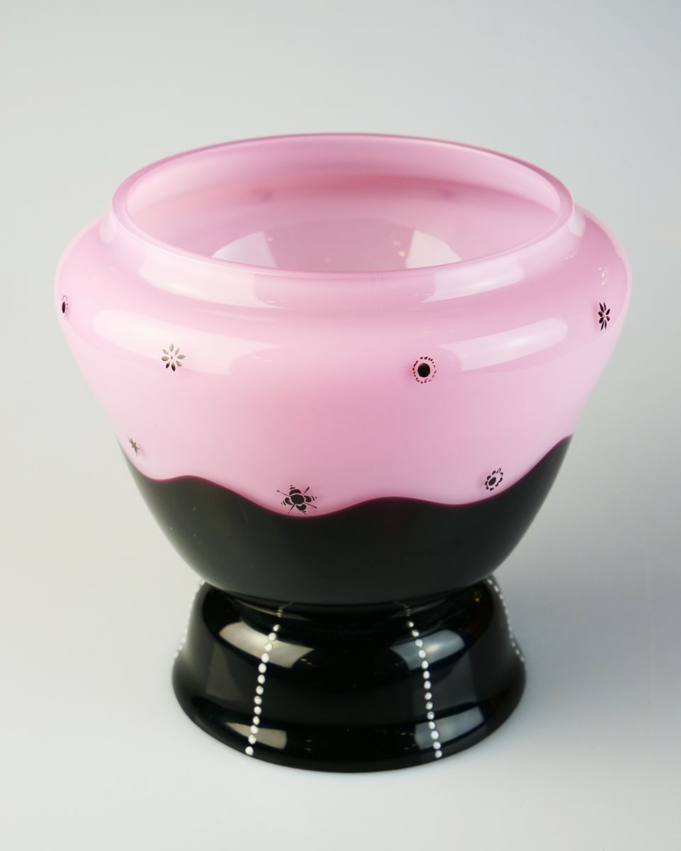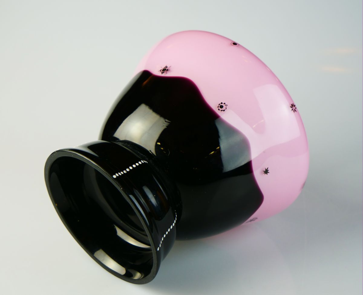 secesní váza šumavské sklárny Loetz z Klášterského Mlýna, dekor Ausführung 165, bezbarvé sklo podjímané sklem růžovým, spodní část z temně fialového bíle tečkovaného skla, malba stylizovaných kvítků schwarzlotem (návrh Dagobert Peche), Rakousko-Uhersko (Čechy), kolem roku 1916; výška 14,5, průměr 15 cm; sběratelsky zajímavé