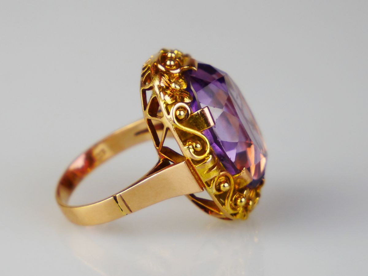 zlatý prsten s velkým ametystem, Au 10,41 g/585/1000, Československo, kolem r. 1935, dobová puncovní značka (lvíček), velikost hlavy 2,5 x 2,2 cm; velikost prstenu 56