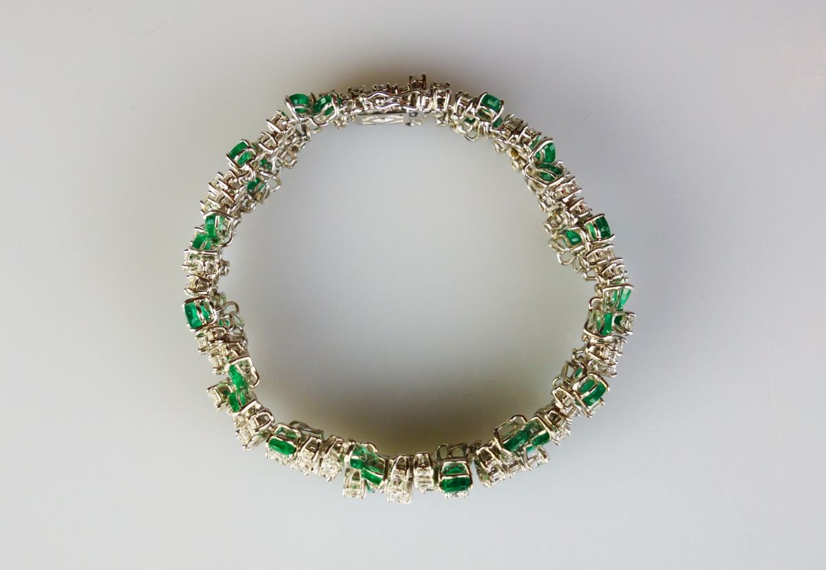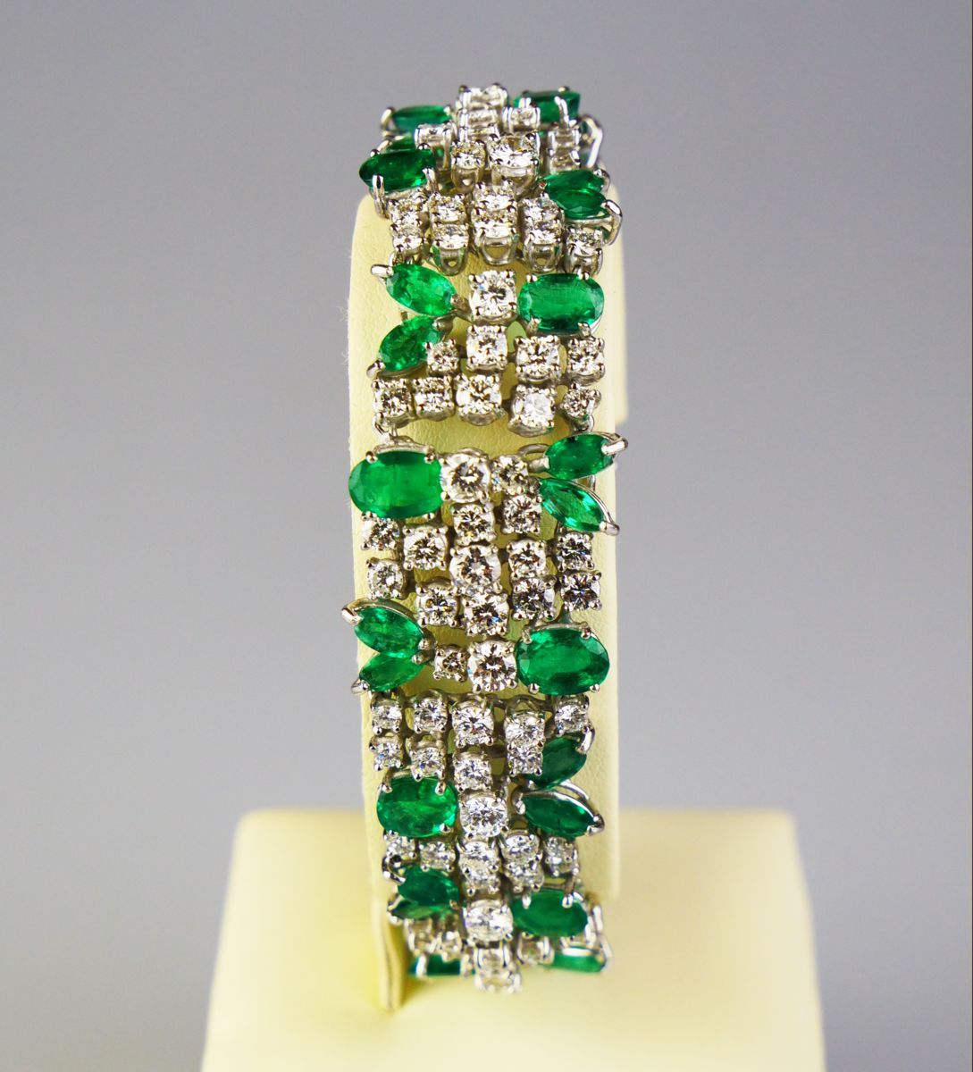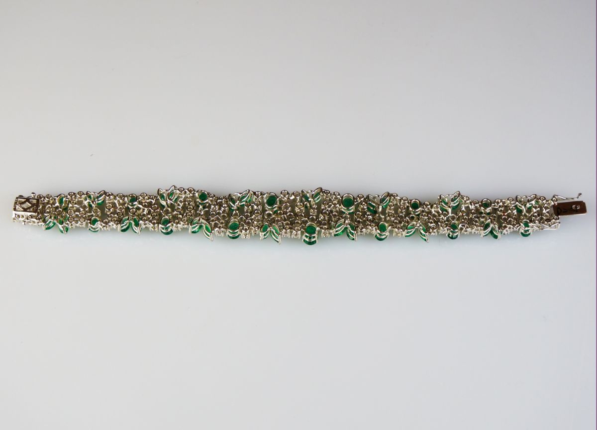 luxusní náramek z bílého zlata, osazený 157 kusy diamantů briliantového brusu velmi dobré kvality o celkové hmotnosti cca 9,78 a 42 kusy přírodních smaragdů oválného briliantového brusu o celkové hmotnosti cca 11,26 ct, Au 37,80g/750/1000, západní Evropa, kolem r. 1995; atest Puncovního úřadu, znalecký posudek; rozměry 18,4 x 1,96 x 0,85 cm