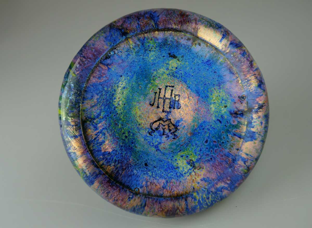 secesní kalamář z mědi a stříbra, zdobený duhovými smalty, Ag btto 240,15 g/800/1000, dílna významného německého výtvarníka Paula Hausteina, Německo, kolem r. 1901, dobový německý punc a rakousko-uherský dovozový punc se značkou budapešťského Puncovního úřadu, signováno autorskou značkou; drobná oprava smaltu, výška 8 cm, průměr 10,5 cm; Paul Haustein (1880-1944) byl známý pro jedinečné ručně aplikované emailové úpravy, jako designér spolupracoval mimo jiné s firmou WMF a jako profesor působil na Kunstgewerbeschule Stuttgart; podobný kalamář je ve sbírkách německého Hessisches Landesmuseum v Darmstadtu; sběratelsky zajímavé