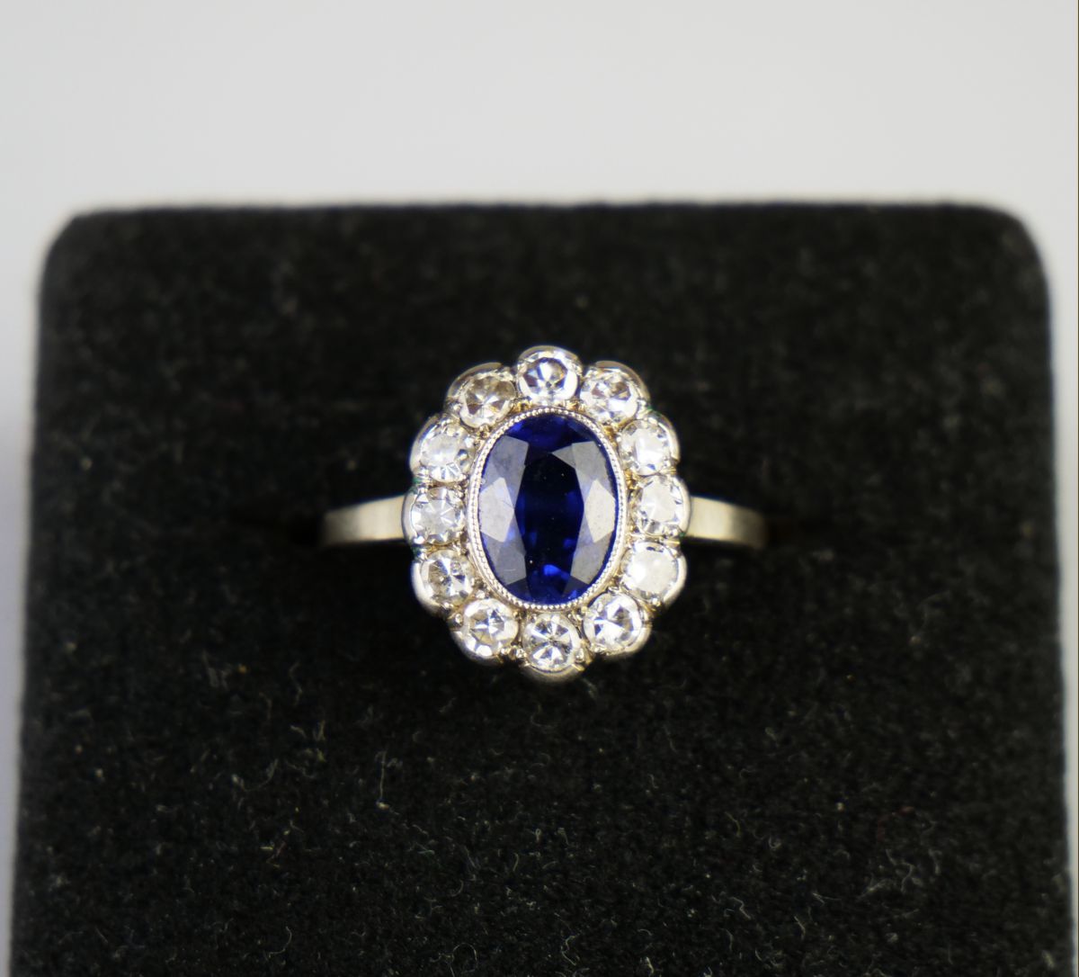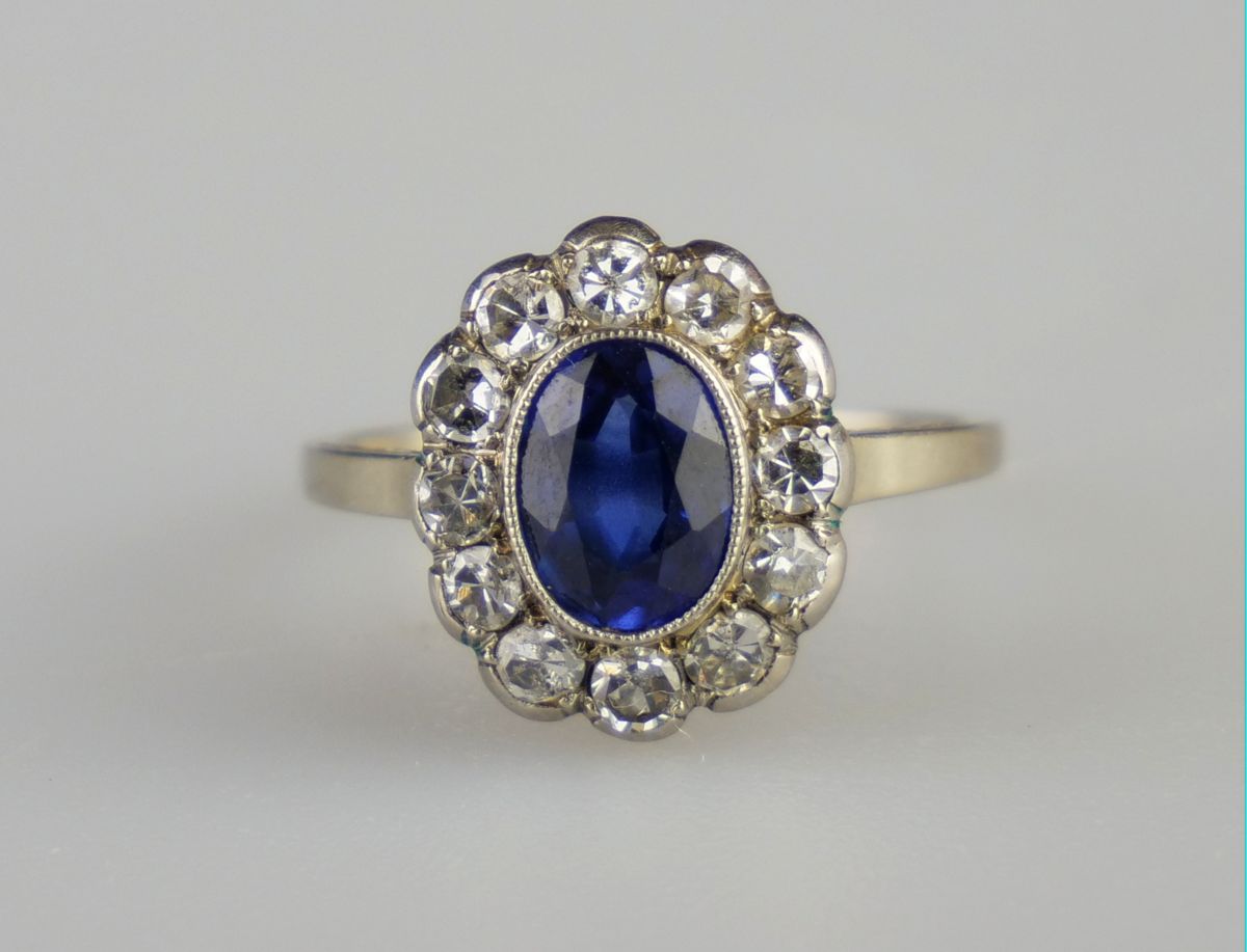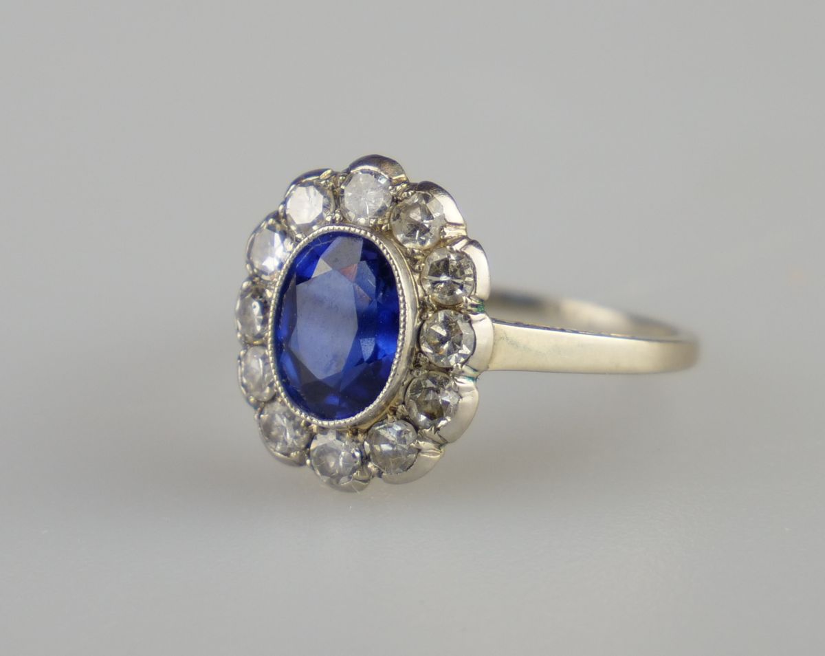 prsten z bílého zlata se syntetickým modrým safírem a diamanty jednoduchého briliantového brusu o celkové hmotnosti cca 0,4 ct, kameny zasazené v platinovém lůžku, Au btto 2,20 g/585/1000, Evropa, kolem r. 1940, atest Puncovního úřadu; velikost prstenu 50