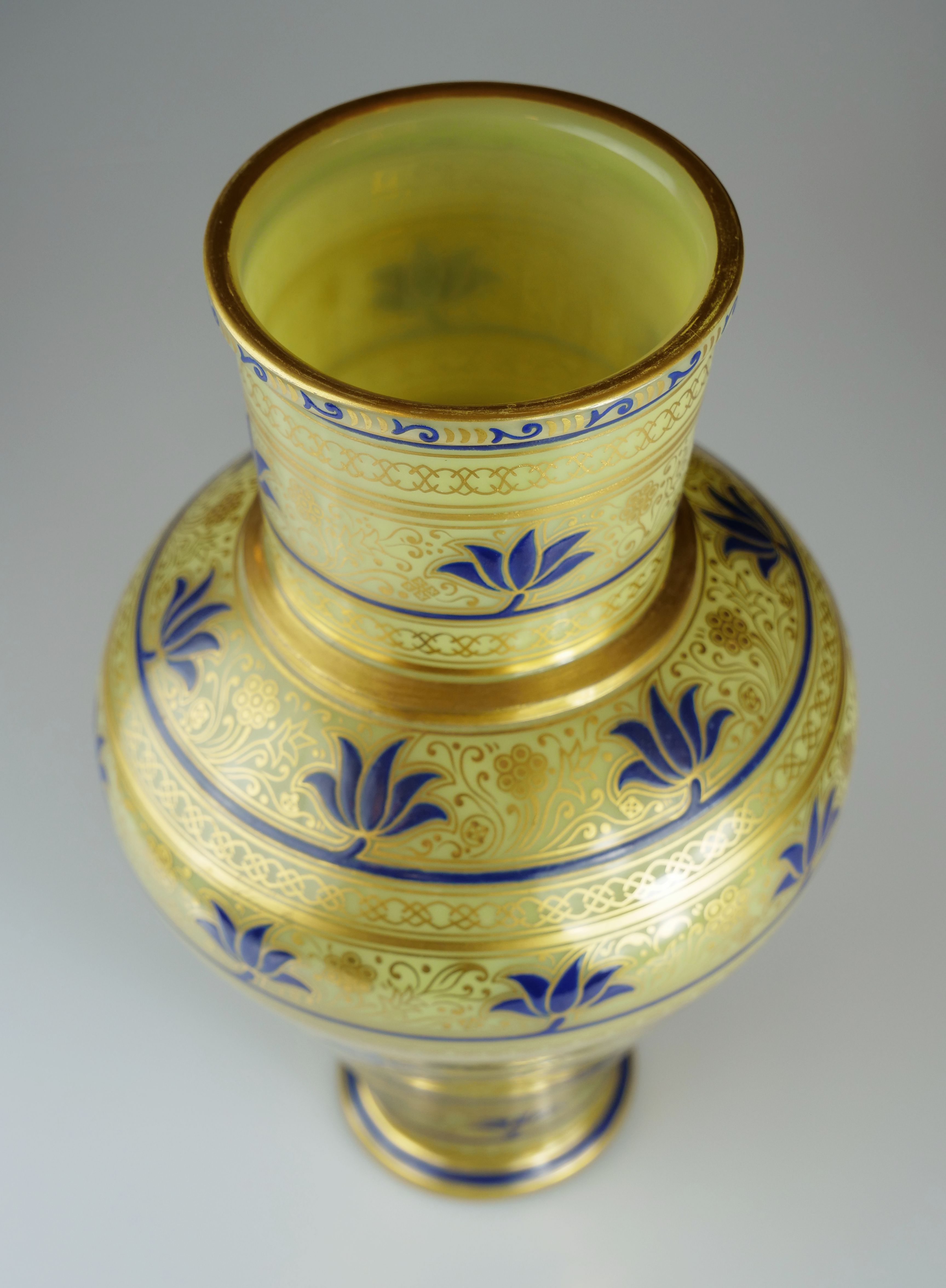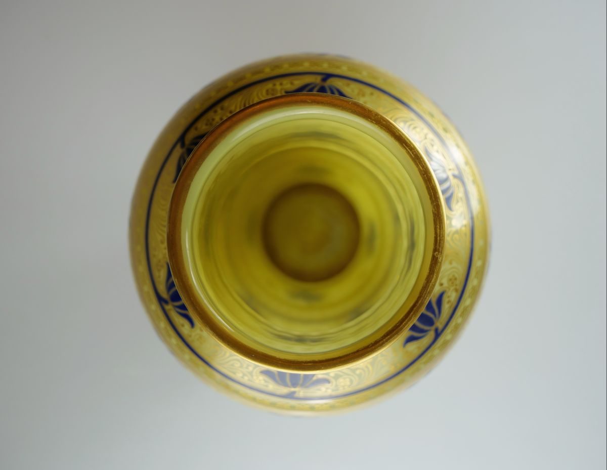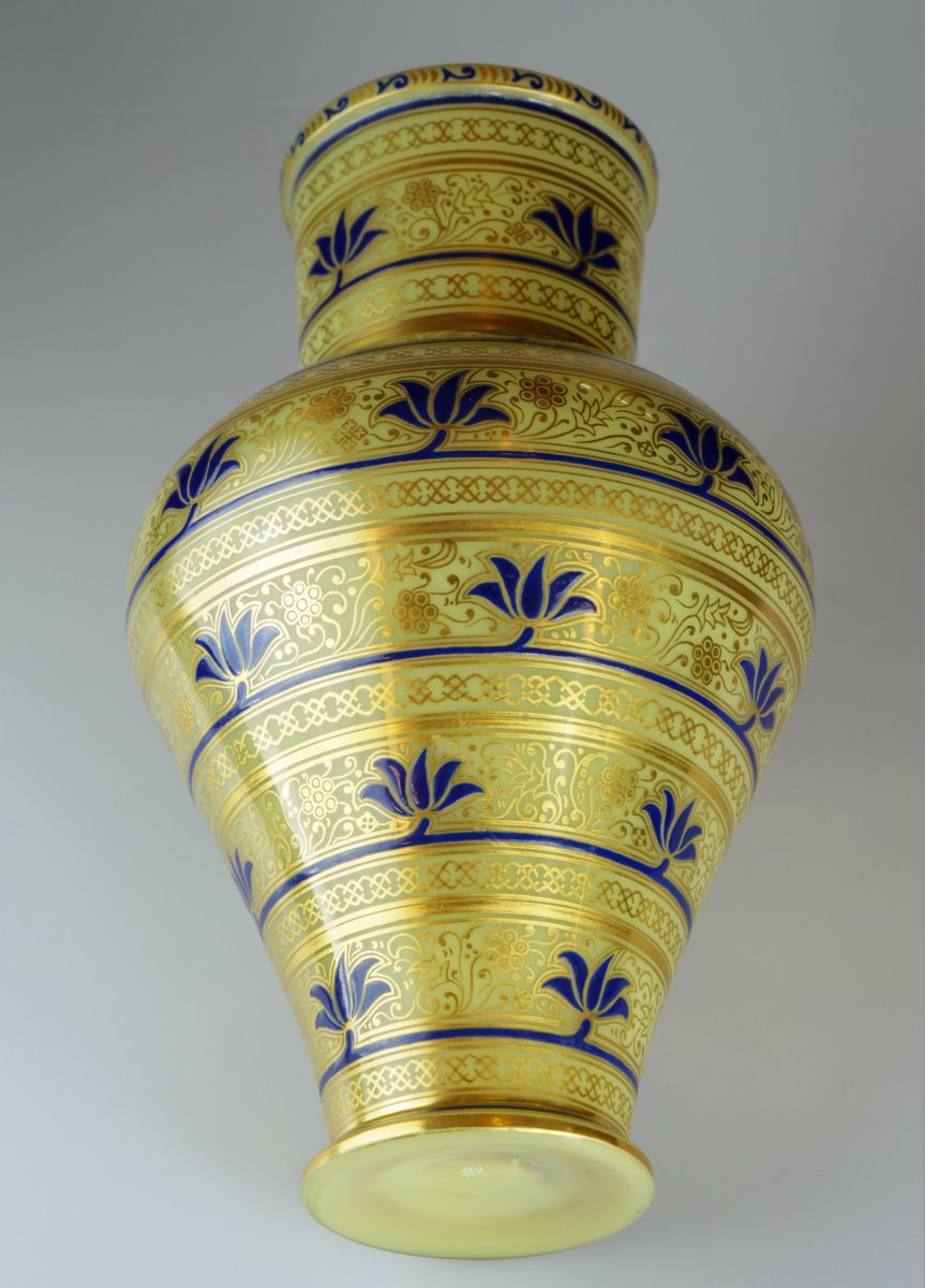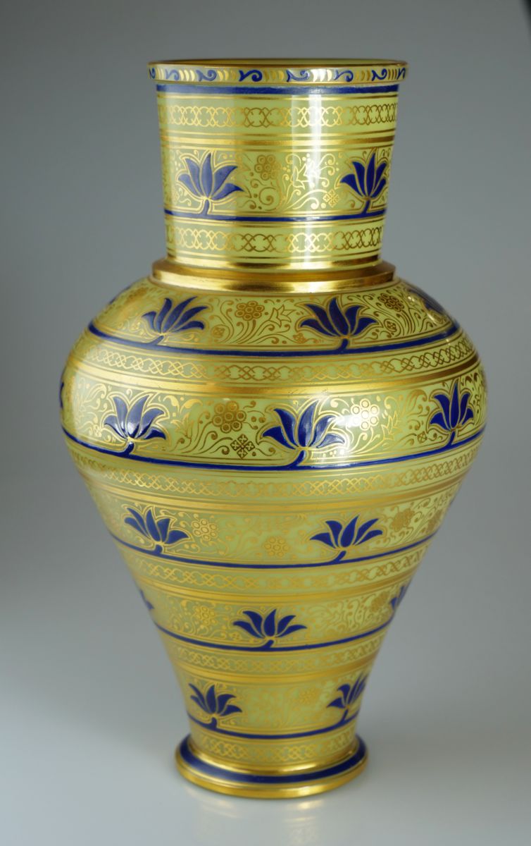 skleněná váza s ornamenty malovanými modrým emailem a zlatou barvou, severní Čechy, vyrobeno pro významnou vídeňskou obchodní firmu J. & L. Lobmeyr, Rakousko-Uhersko, kolem r. 1890, značeno tradiční firemní značkou; výška 24 cm, průměr 15 cm; sběratelsky zajímavé