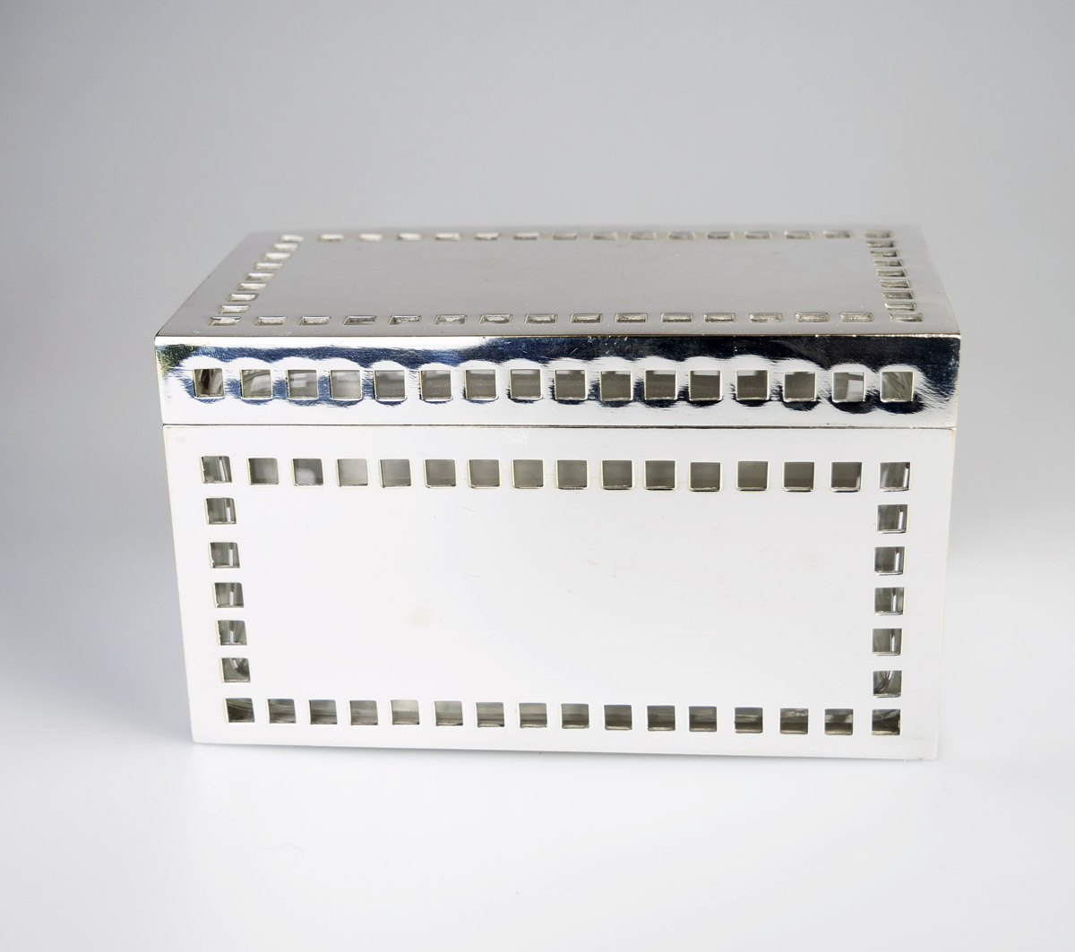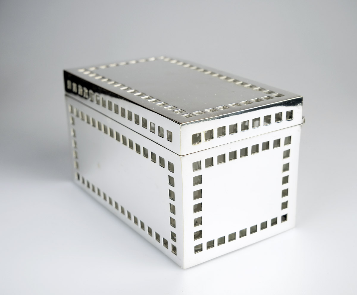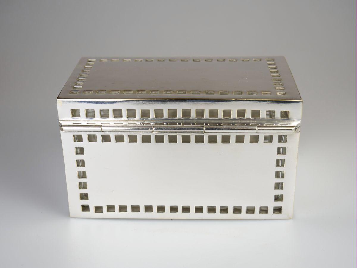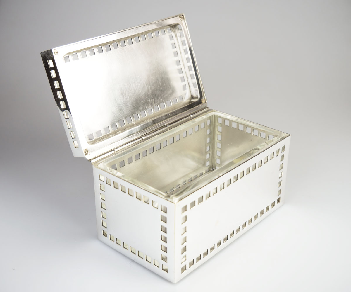 skleněná dóza v mosazné pokovované montáži, geometrická secese, montáž se značkou vídeňské firmy Moritz Hacker, minimalistické provedení pod vlivem návrhů Josefa Hoffmanna, Rakousko-Uhersko, Vídeň, kolem r. 1915; rozměr 14,2 x 9 x 8,2 cm