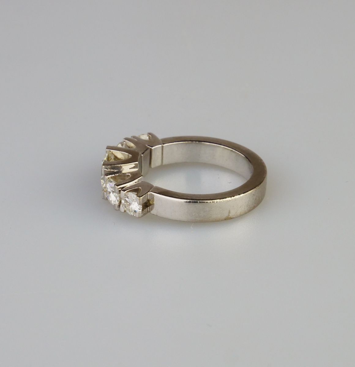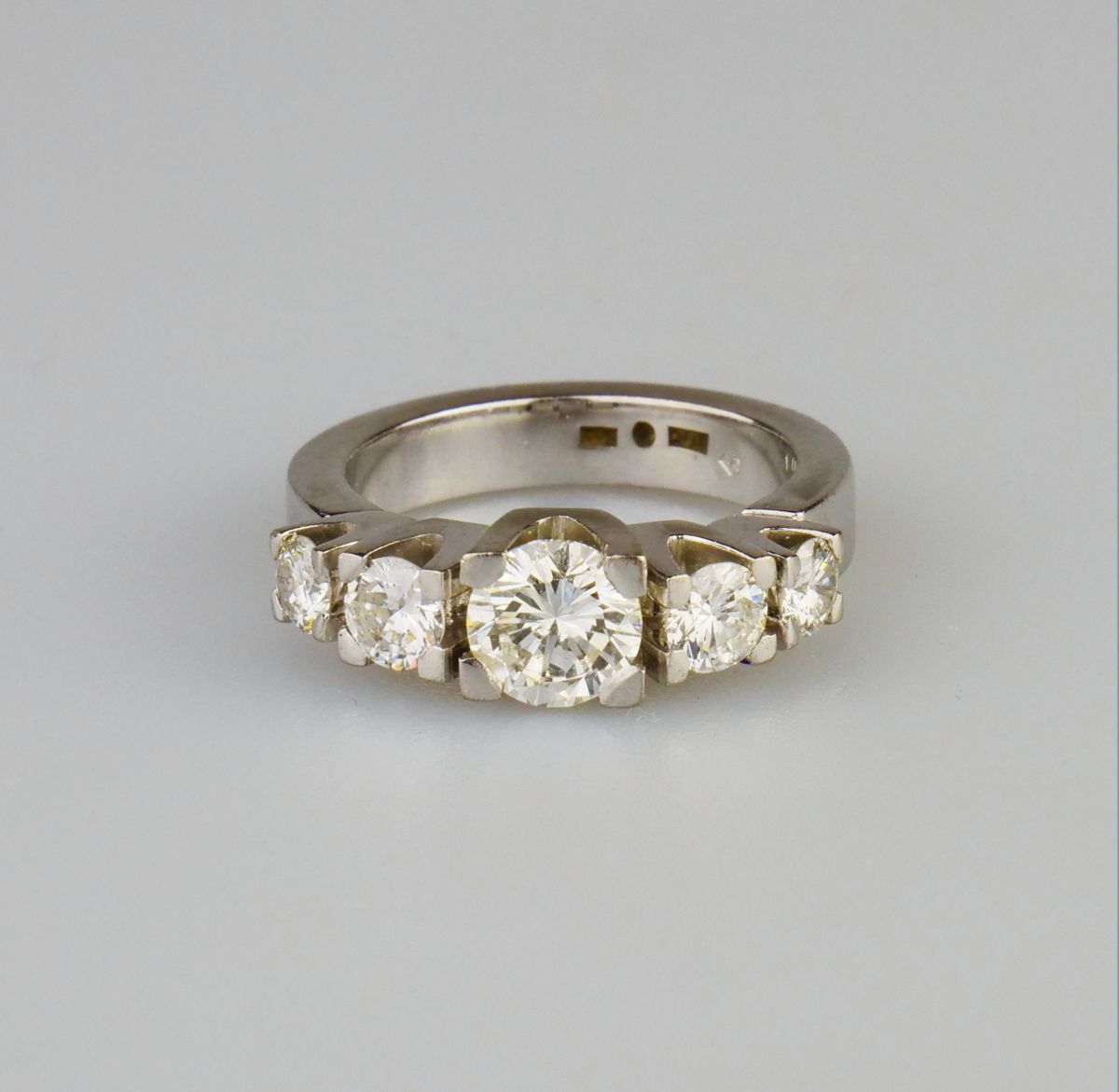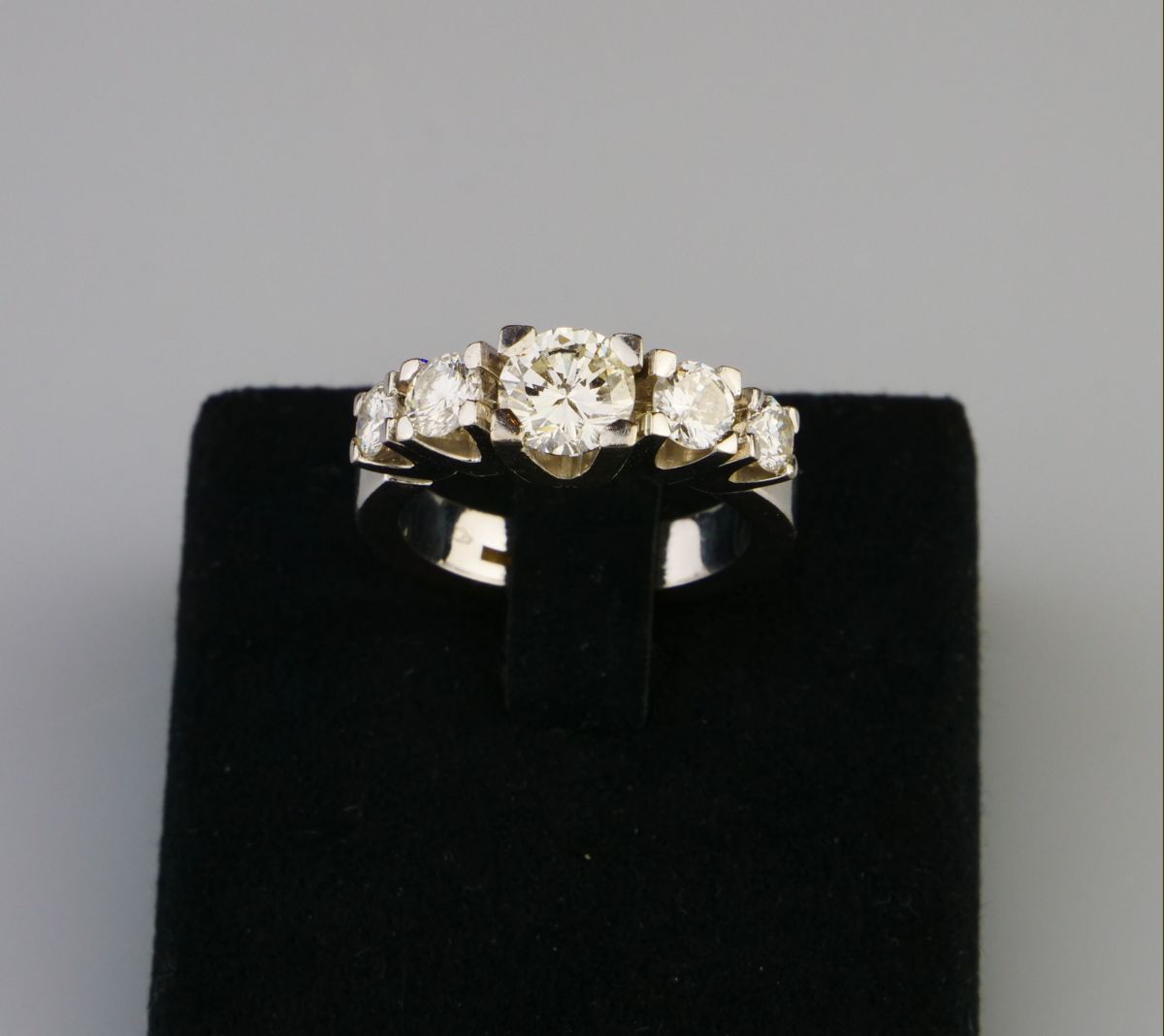 robustní prsten z bílého zlata s diamanty briliantového brusu, centrální diamant briliantového brusu o hmotnosti cca 1,10 ct, barva G-H, kvalita Si1, dále dva diamanty 0,33 ct a 0,35 ct v barvě G-H-I a výjimečné čistotě IF, celkem s dalšími dvěma kameny je na prstenu cca 2,24 ct diamantů, Au 11,58 g/750/1000, Švédsko, kolem r. 1995, individuální zakázková práce, pozdější český punc; znalecký posudek; velikost prstenu 56