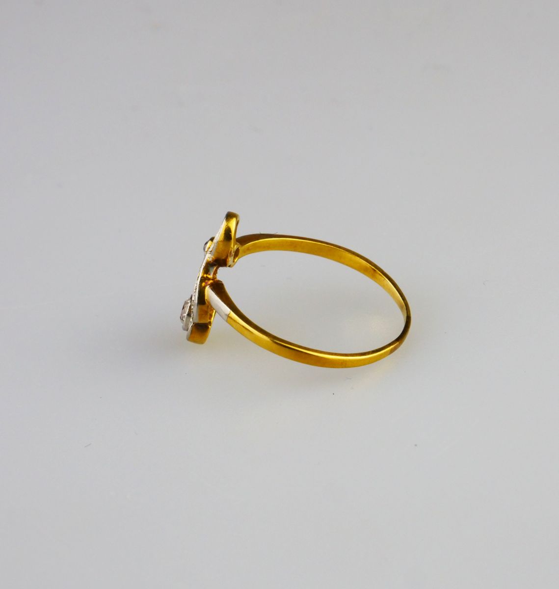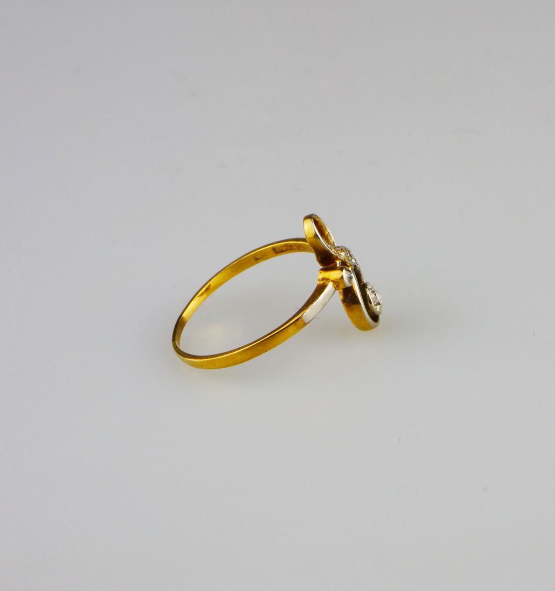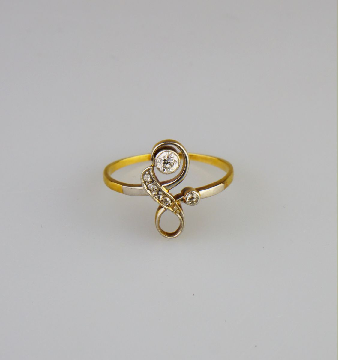 pozdně secesní drobnější zlatý prsten se 6 diamanty briliantového brusu o celkové hmotnosti cca 0,15 ct, kameny vsazené v platině, Au + Pt 2,05 g/585 + 900/1000, západní Evropa, kolem r. 1920; atest Puncovního úřadu; velikost prstenu 56