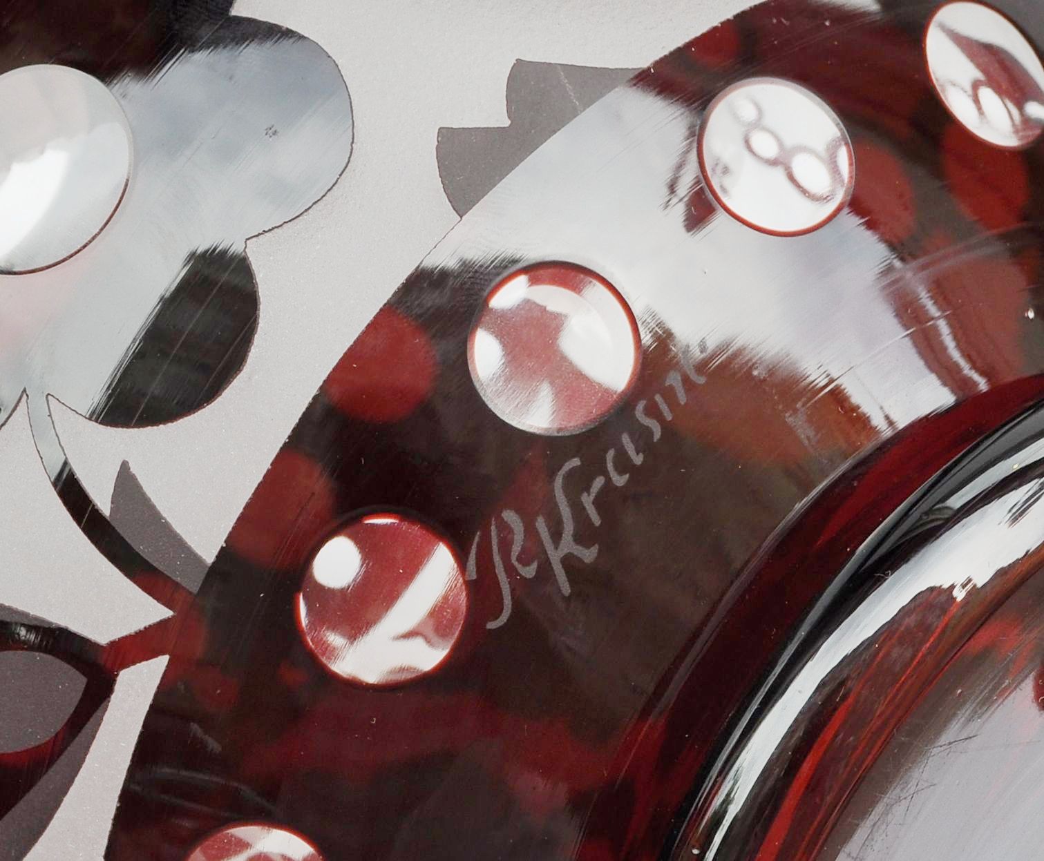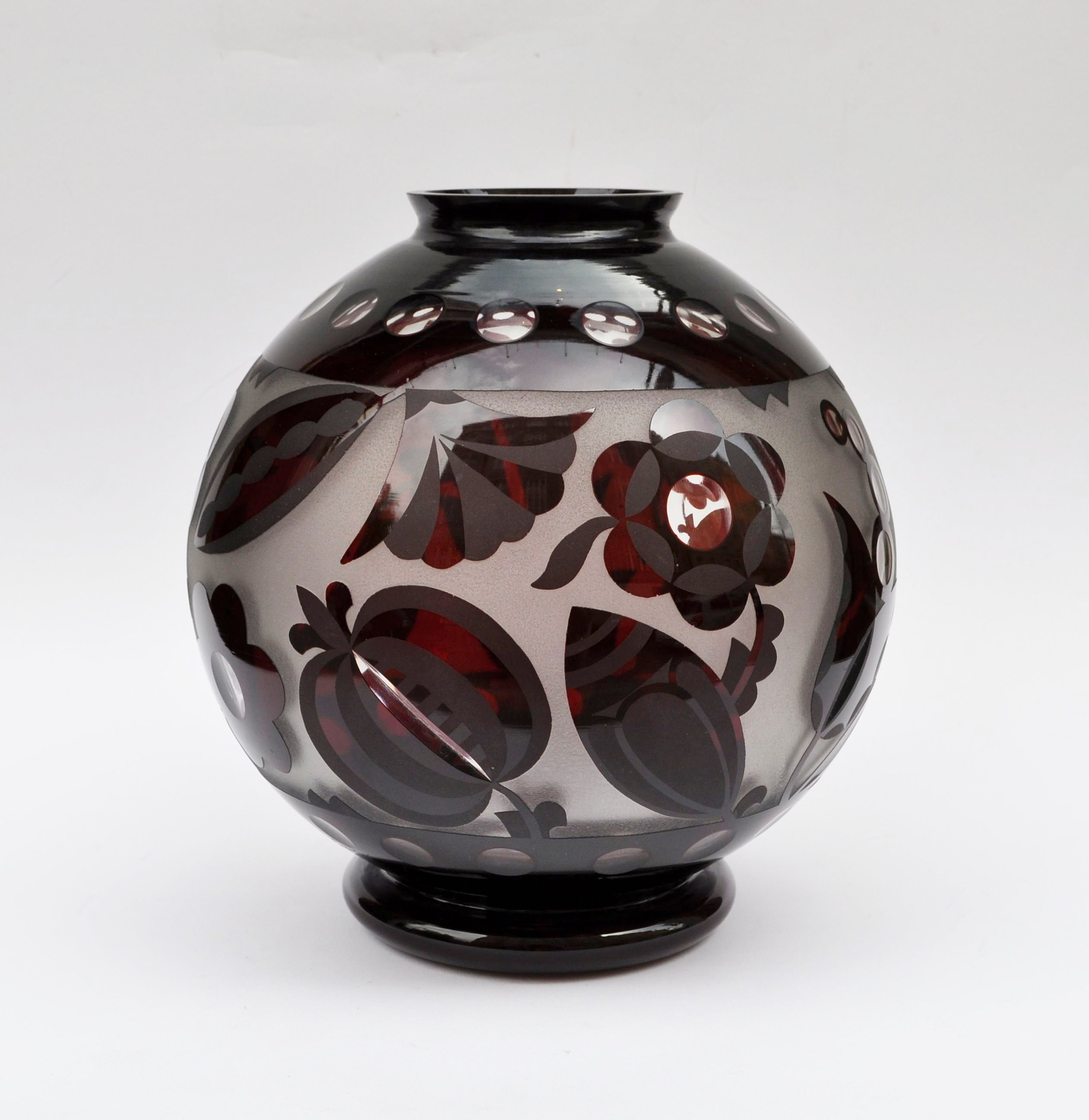 art deco váza firmy Salomona Reicha z moravského Krásna, čiré sklo vrstvené sklem tmavě granátovým, leptaný, matovaný a broušený dekor se stylizovanými květinami, Československo, kolem roku 1935, značeno Krásno; výška 25,5 cm