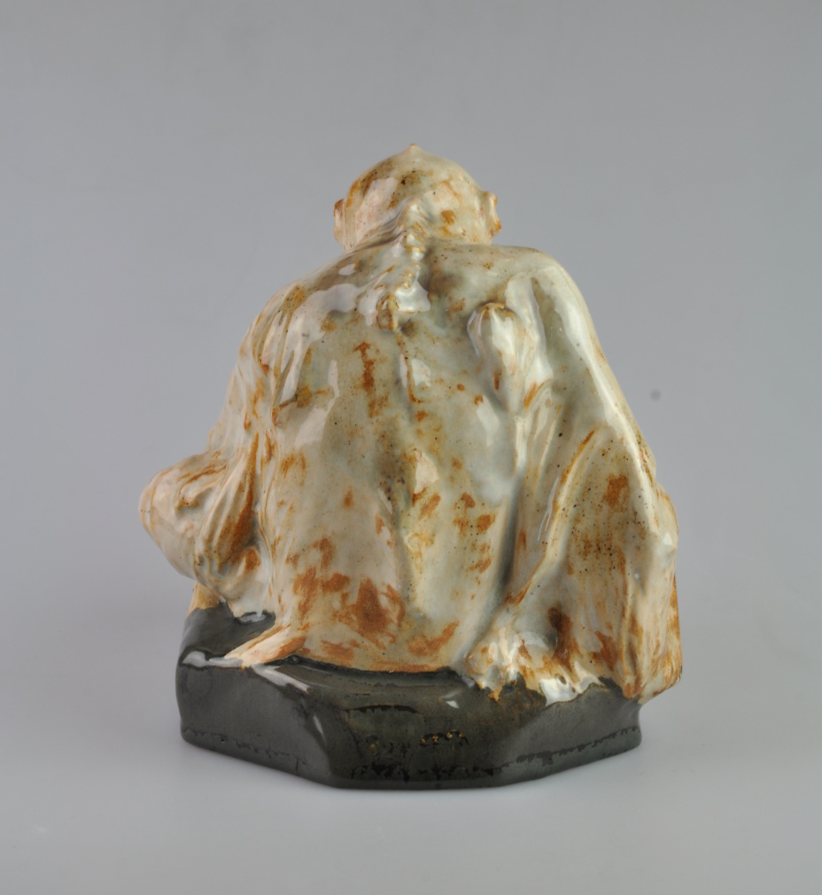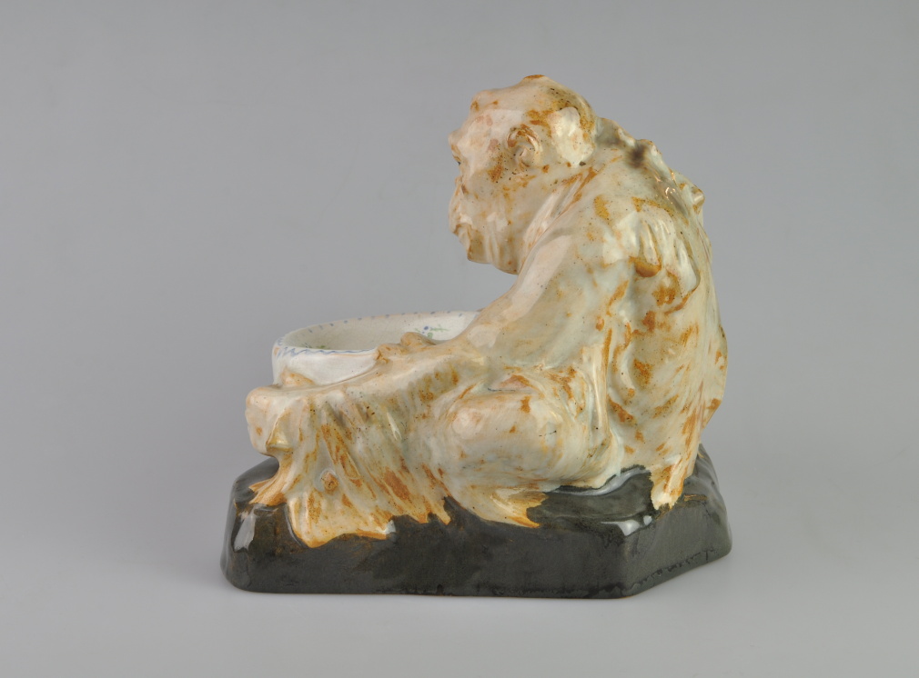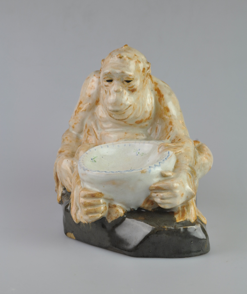 figurální keramická miska v podobě opice, glazovaná, Bechyně, Československo, kolem roku 1920; výška 15 cm, délka 17 cm, šířka 14 cm