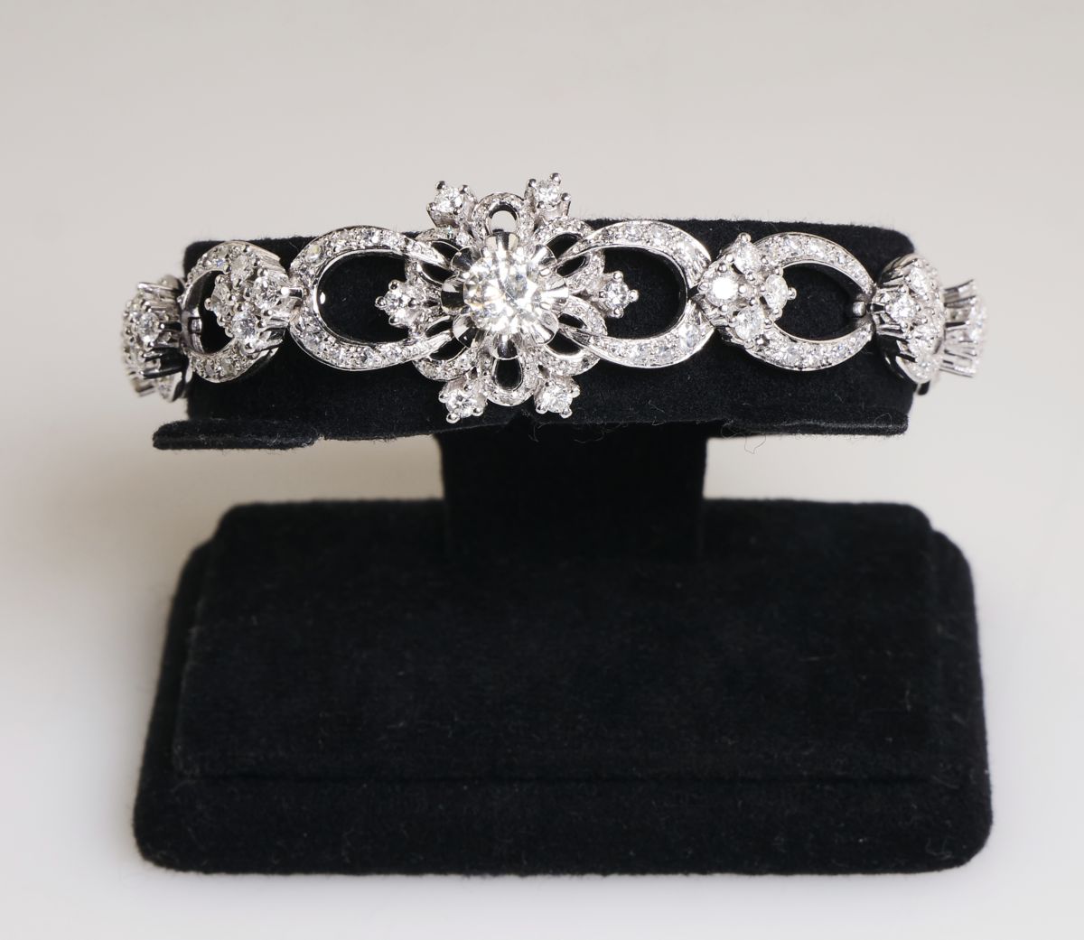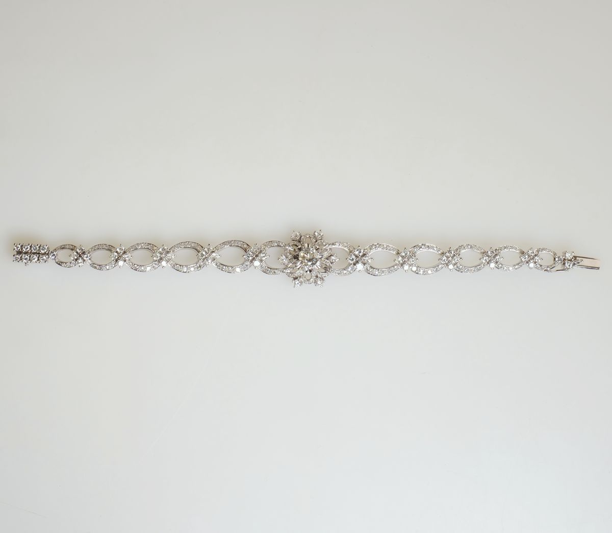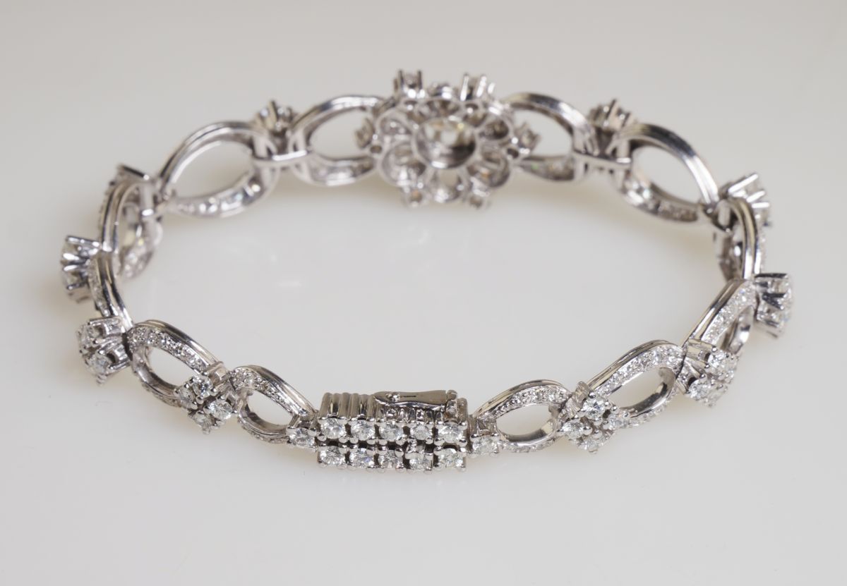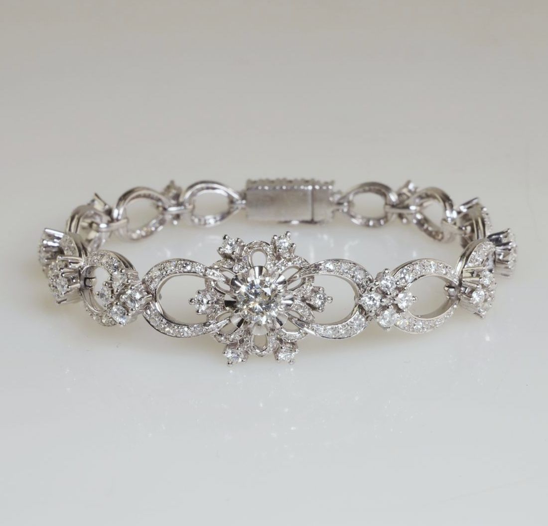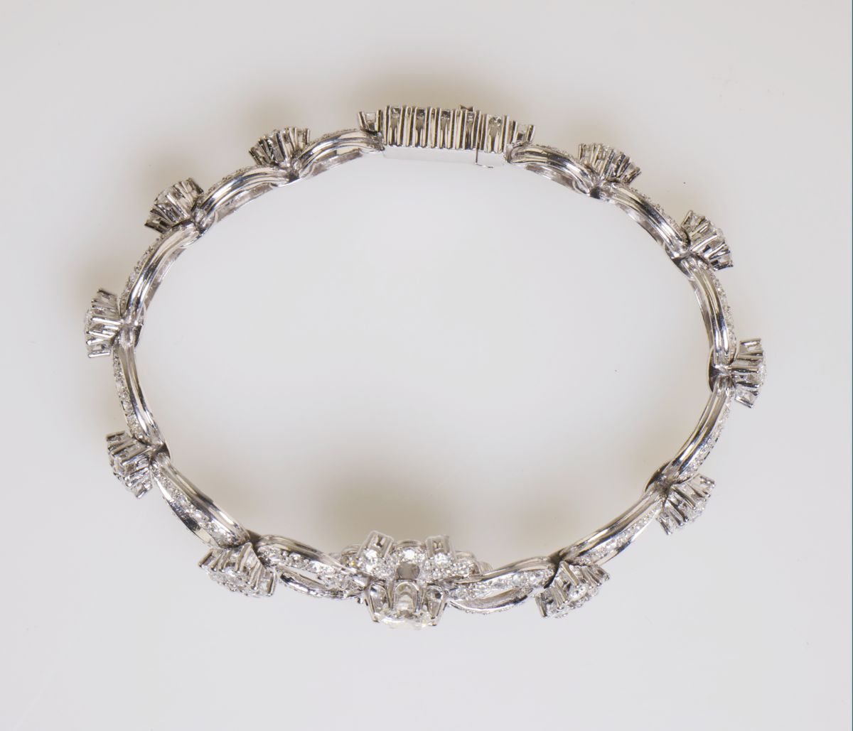 platinový náramek s diamanty briliantového brusu, Pt btto 30,56 g/800/1000, centrální diamant briliantového brusu má hmotnost cca 0,71 ct, čistotu P1, barvu M-N, celková hmotnost diamantů je cca 4,70 ct, západní Evropa, kolem r. 1990; atest Puncovního úřadu, znalecký posudek; šířka 1,77 cm, délka 17,8 cm