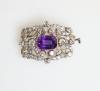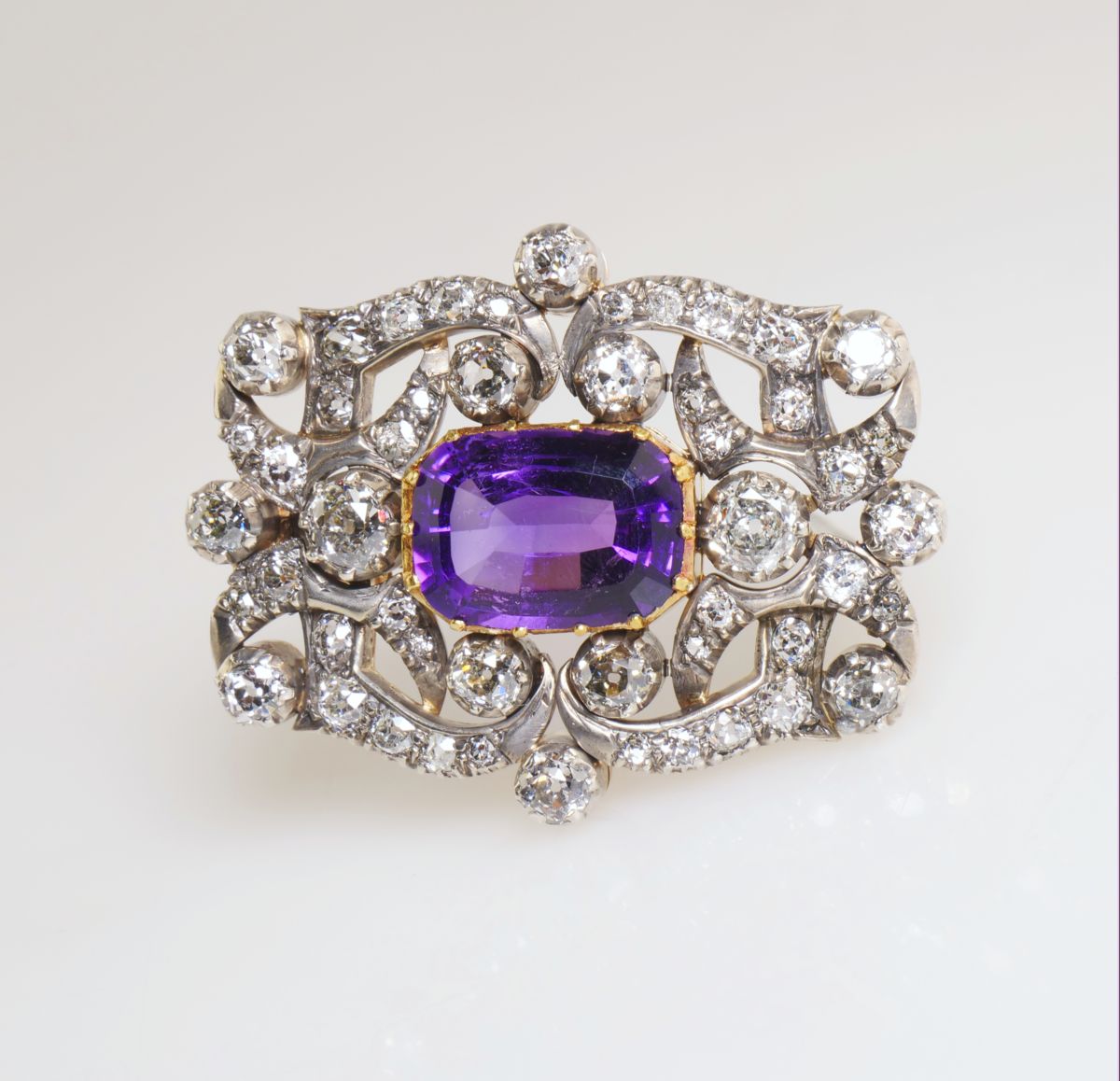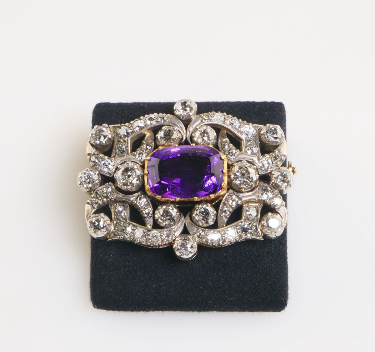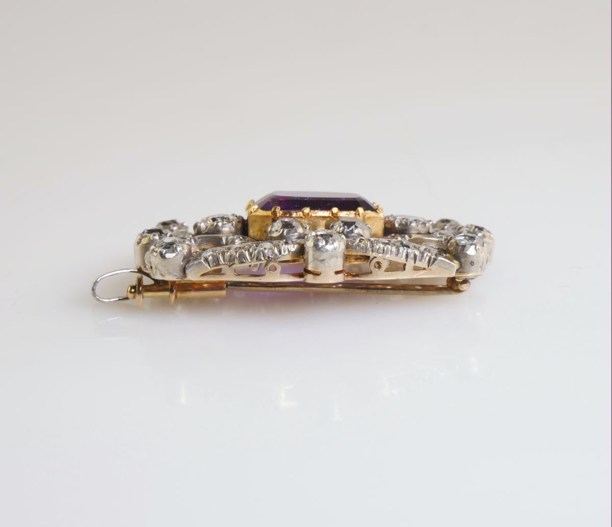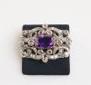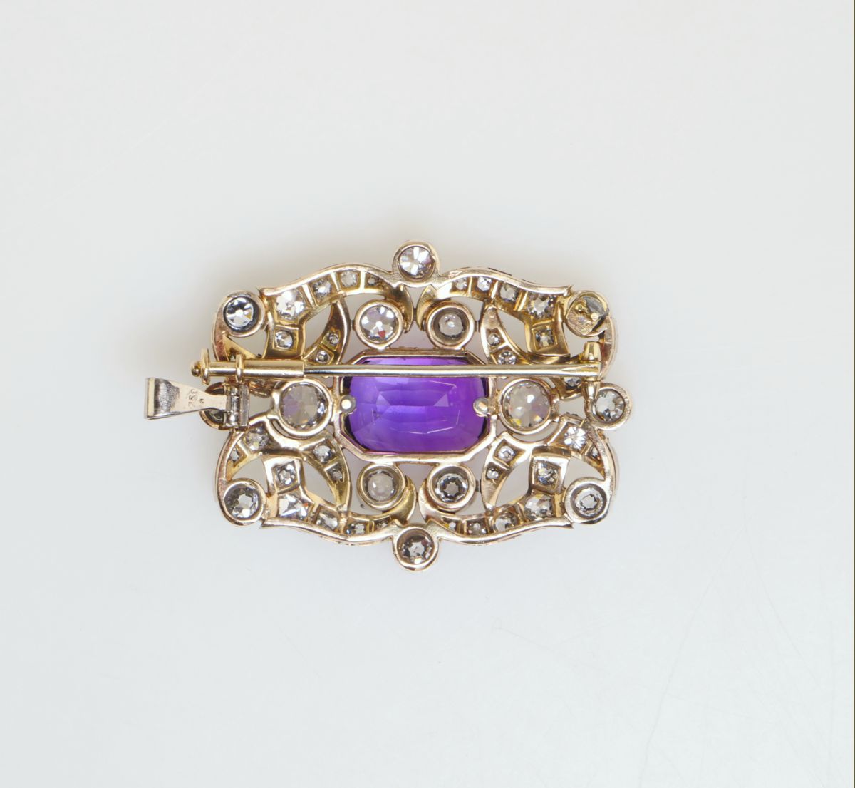zlatá brož s ametystem a diamanty vsazenými ve stříbře, Au+Ag btto 23,98 g/750+585+800/1000, celková hmotnost diamantů starého briliantového brusu je cca 5,5 ct, Au+Ag btto 23,98 g/750+585+800/1000, lze použít i jako závěs, západní Evropa, kolem r. 1920, pozdější rakouský dovozový punc, atest Puncovního úřadu; rozměry 5,2 x 3,5 x 1,4