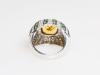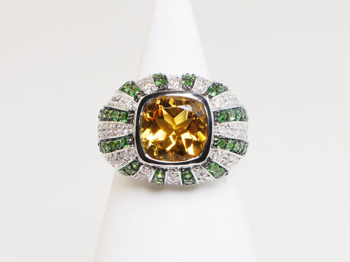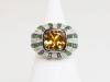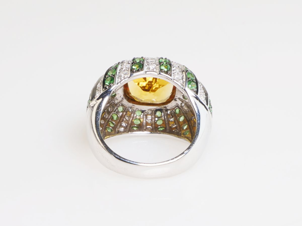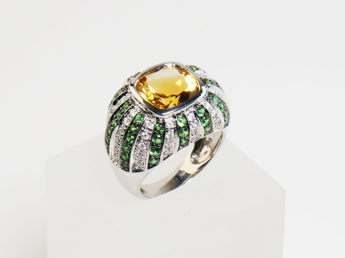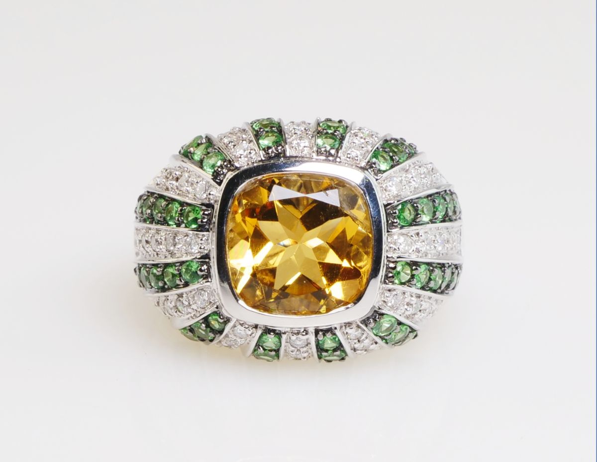 zlatý prsten s citrínem, diamanty a demantoidy, Au btto 8,77 g/585/1000, citrín starého velmi dobrého briliantového brusu má hmotnost cca 3,7 ct, 54 diamantů briliantového brusu má hmotnost cca 0,54 ct, 52 namibijských demantoidů má celkovou hmotnost cca 1,04 ct, západní Evropa, kolem r. 2000, pozdější český punc (labuť), rozměry 25,7 x 22,8 x16,7 mm; znalecký posudek; velikost prstenu 54